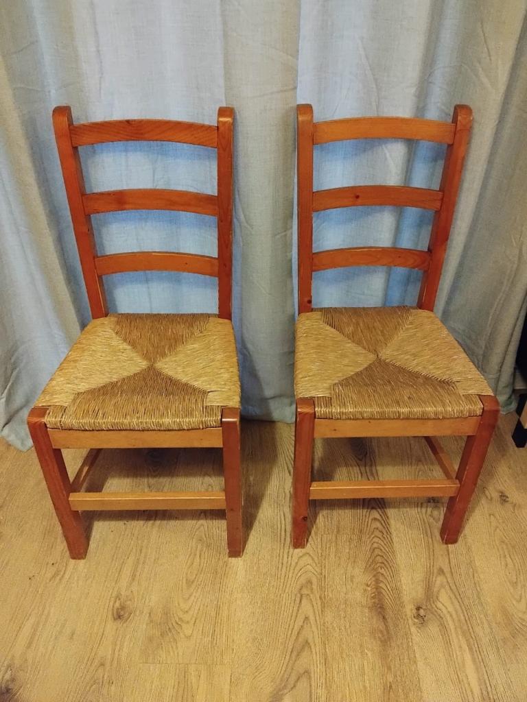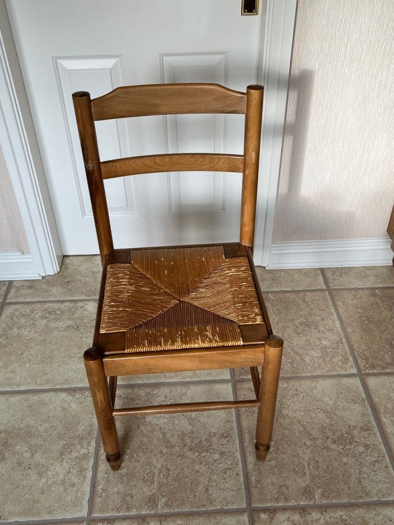 Four solid wooden chairs .