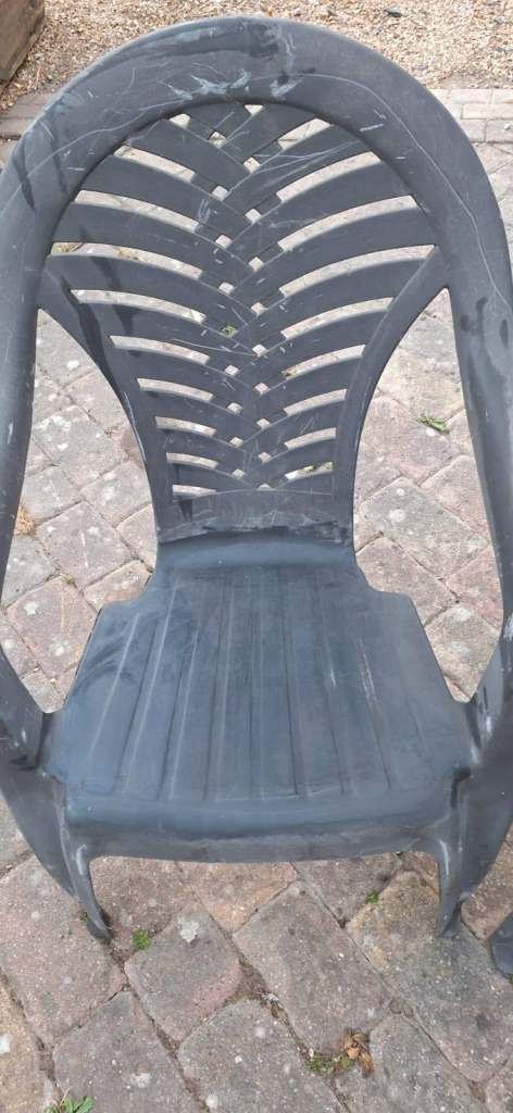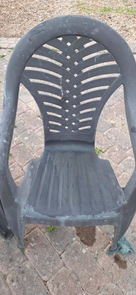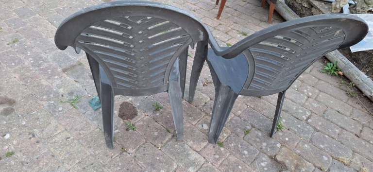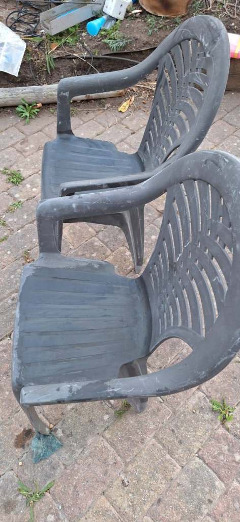 A pair of matching grey plastic outdoor chairs in used but good condition. Each measures 36 inches high by 23 inches deep by 22 inches wide. Can deliver for fuel costs.