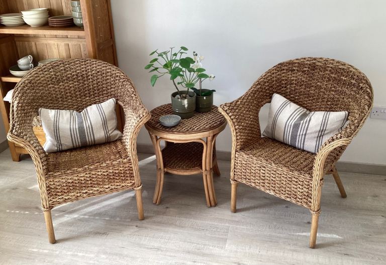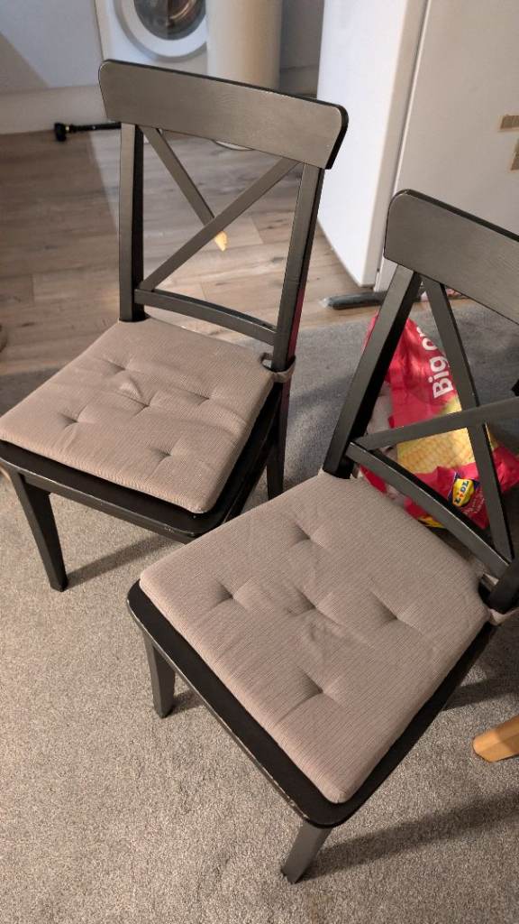 Offered for sale is a lovely pair of solid oak dining chairs. These chairs, purchased approximately 5 years ago, have been used sparingly in our formal dining room, hence their excellent condition. The oak frames are sturdy and show only minimal signs of wear; the original woven seats are immaculate with no fraying or stains. These chairs are not only aesthetically pleasing but also remarkably comfortable, providing excellent back support for extended meals. Selling due to redecorating and a change in style. These are built to last and will add a touch of classic elegance to any dining space.