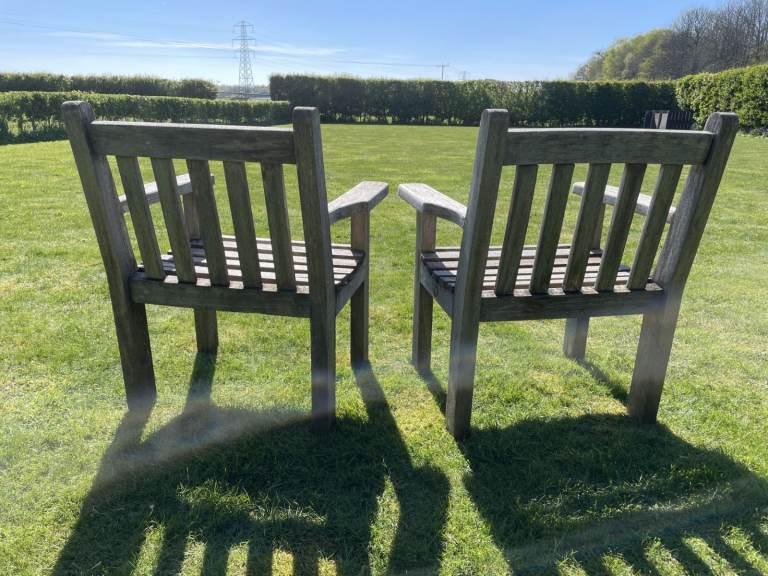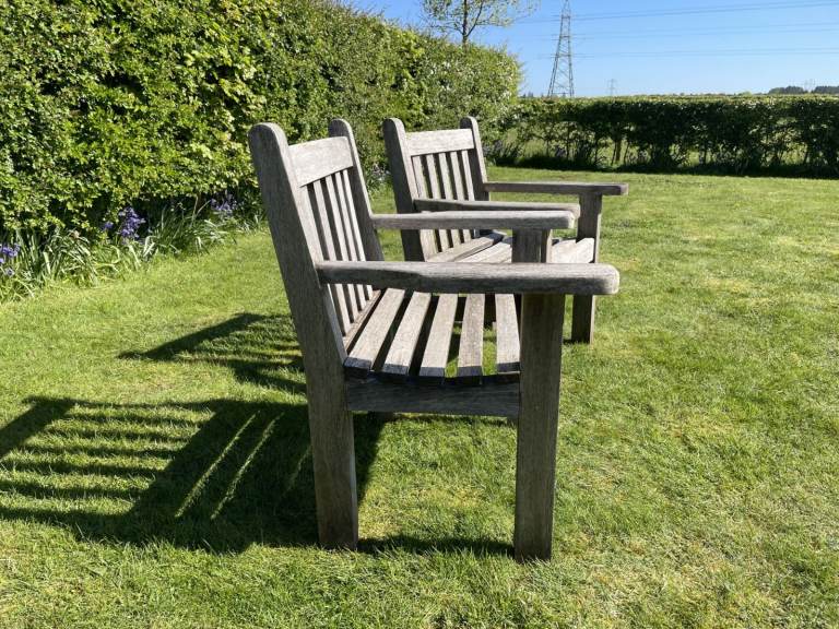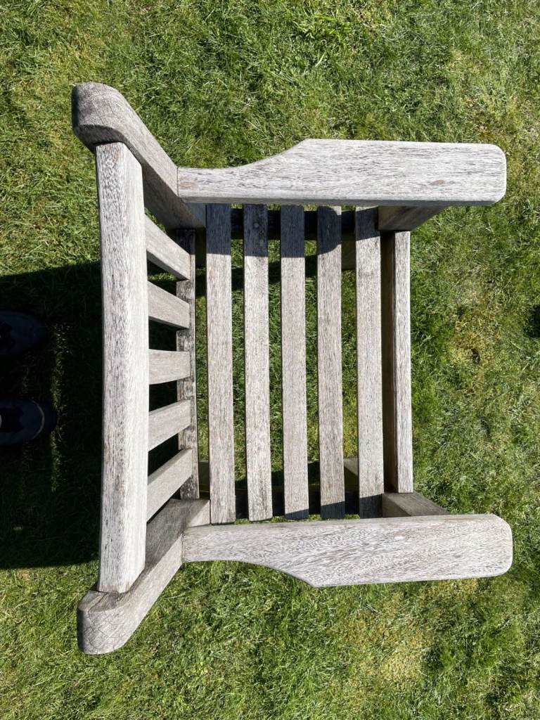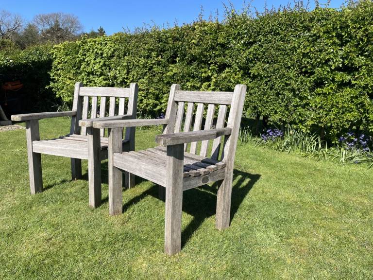 These well-used hardwood chairs were made by Rain or Shine Garden Furniture in Swindon over 30 years ago and are as solid now as the day we bought them. They are ideal for having a coffee in a sunny spot in the garden and can be left outside all year, although we have always put them under cover in the winter.