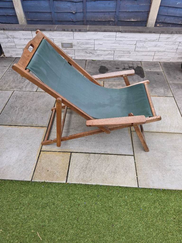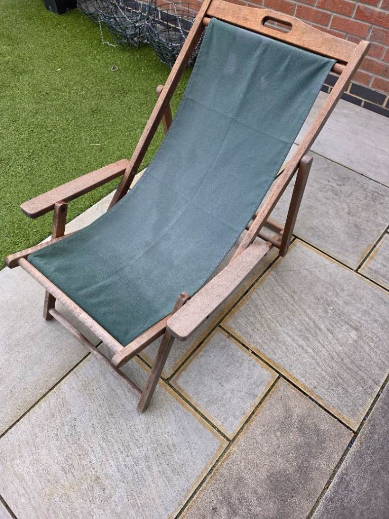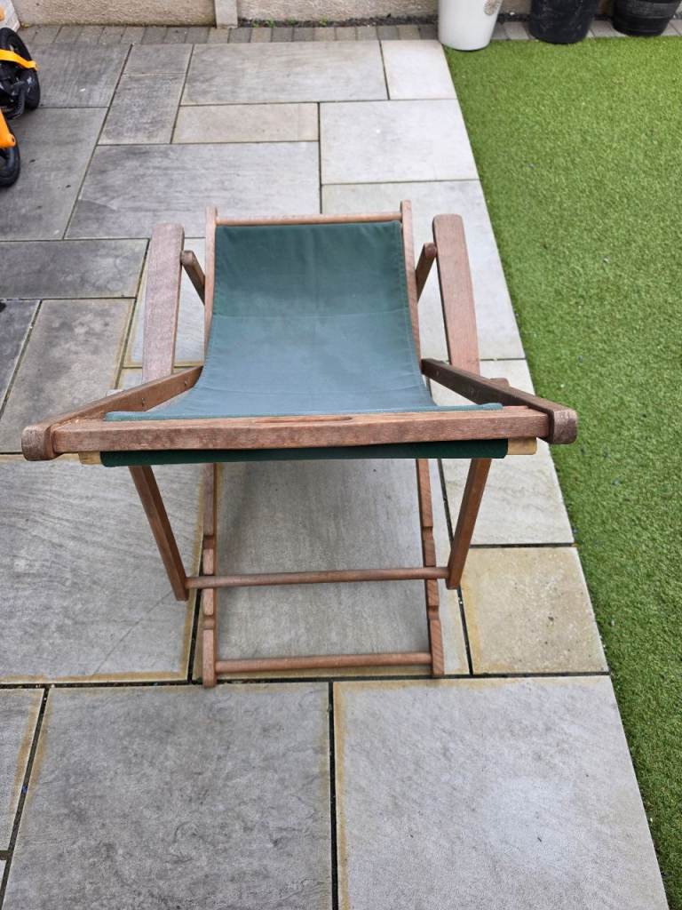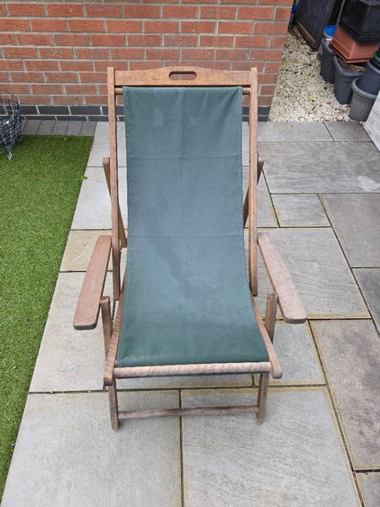Wooden folding deck chair / sun lounger in good used condition. Cleaned and ready to use. Solid frame with green sling seat. A few marks and light weathering from outdoor use, but overall still a nice usable chair for the garden or patio. Folds away for storage. Collection from Stapleford.