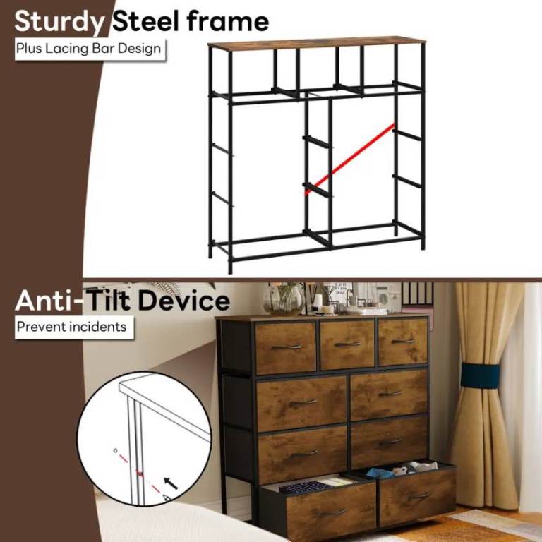 Steel Frame Freestanding 9 Drawer Storage Cabinet, Storage Organizer for Bedroom Living Room 100 x 30 x 99cm - Brown