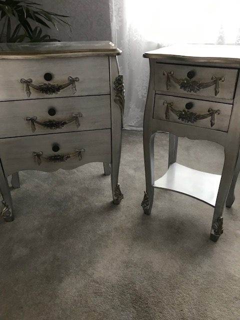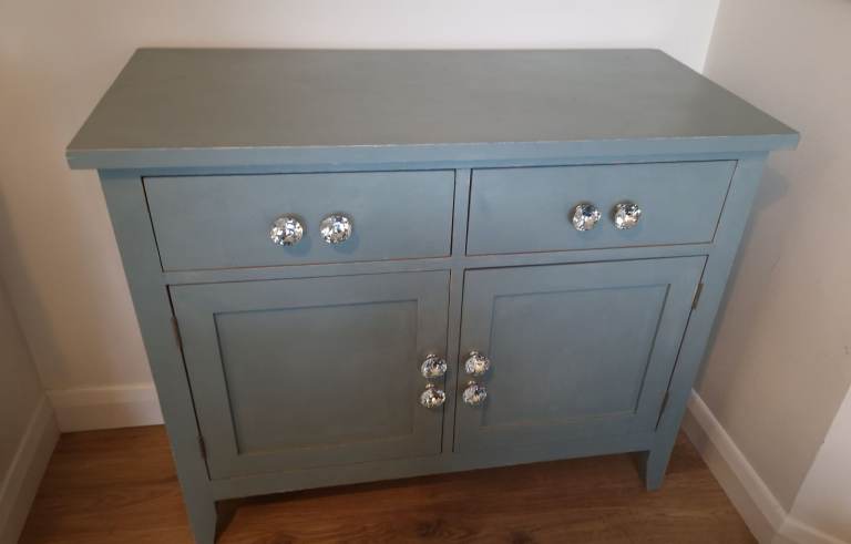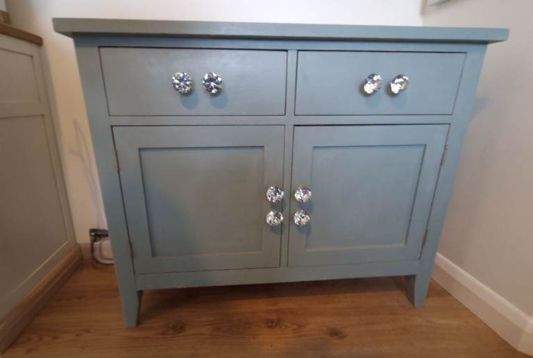 • Matching storage cabinet – A solid oak piece with the same painted finish as the table. It includes 2 drawers and 2 cupboards, all fitted with attractive crystal knobs for a touch of elegance.