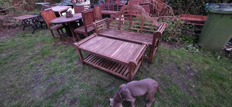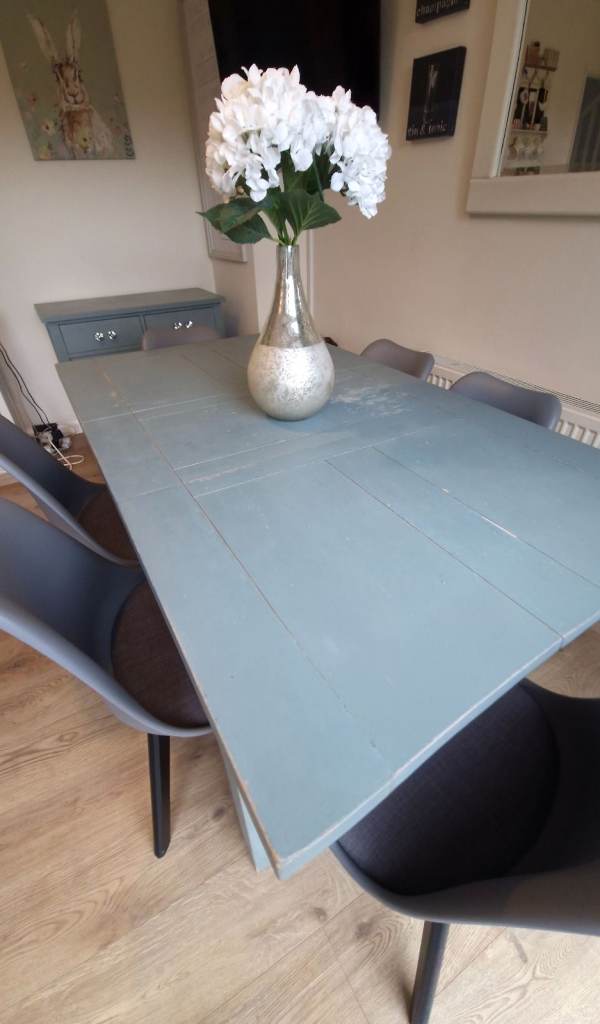 • x1 Large wooden dining table – Seats six comfortably, with a distressed painted finish that gives it a warm, vintage character. Can open up and extend.