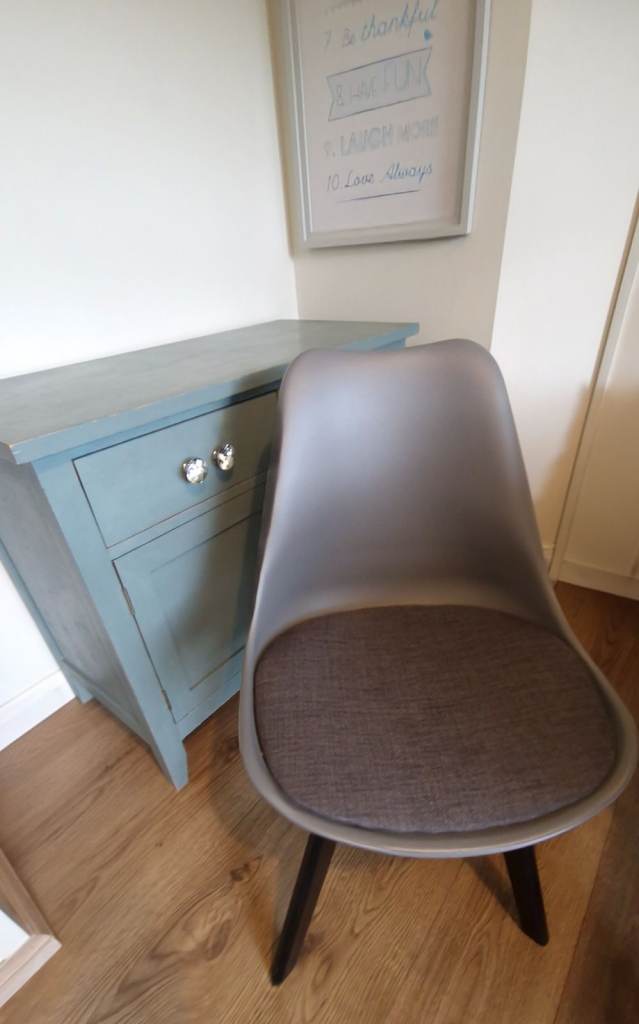 • 6 modern dining chairs – Each chair features a smooth grey shell design with cushioned fabric seats for excellent comfort and style.