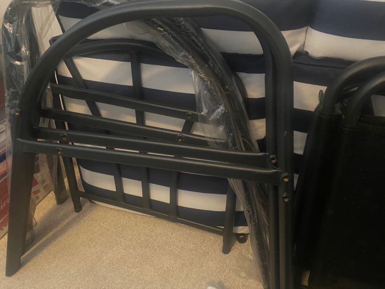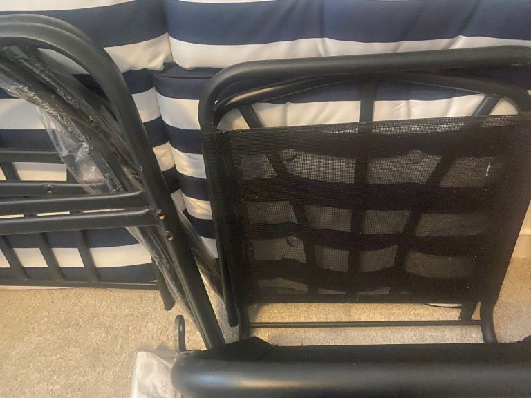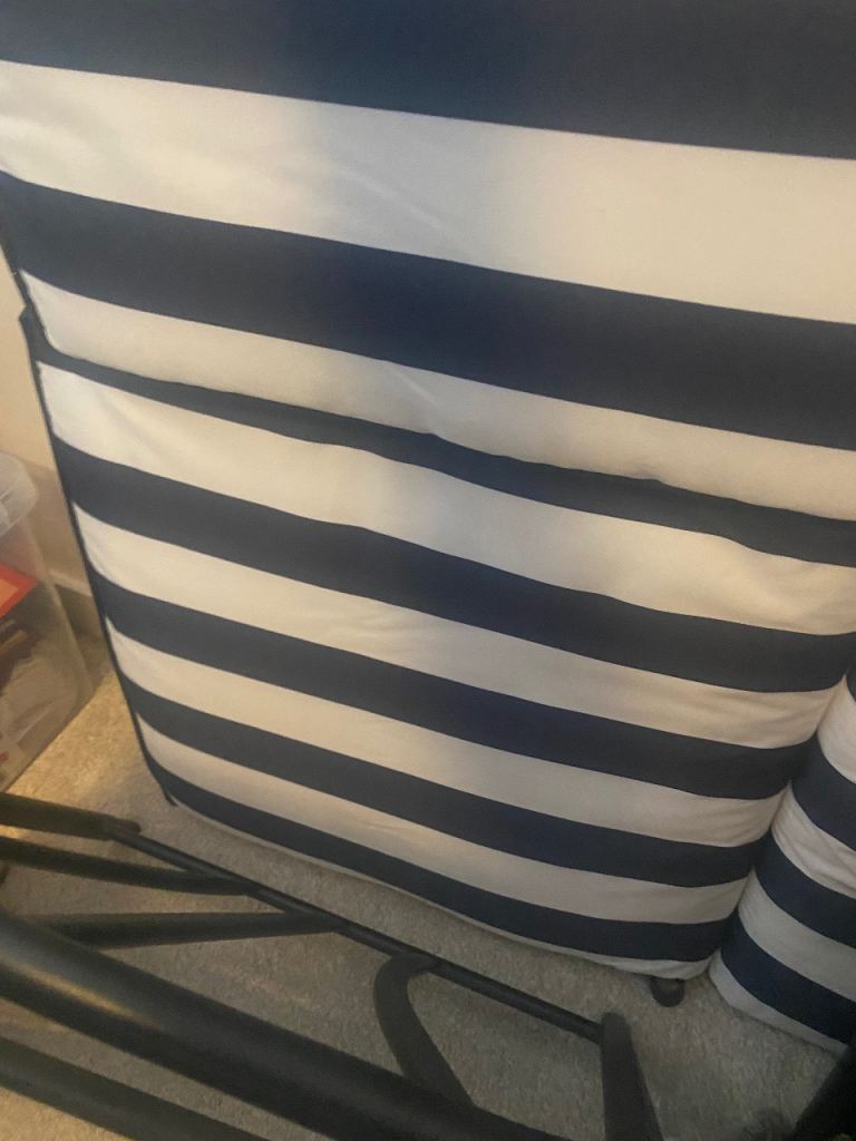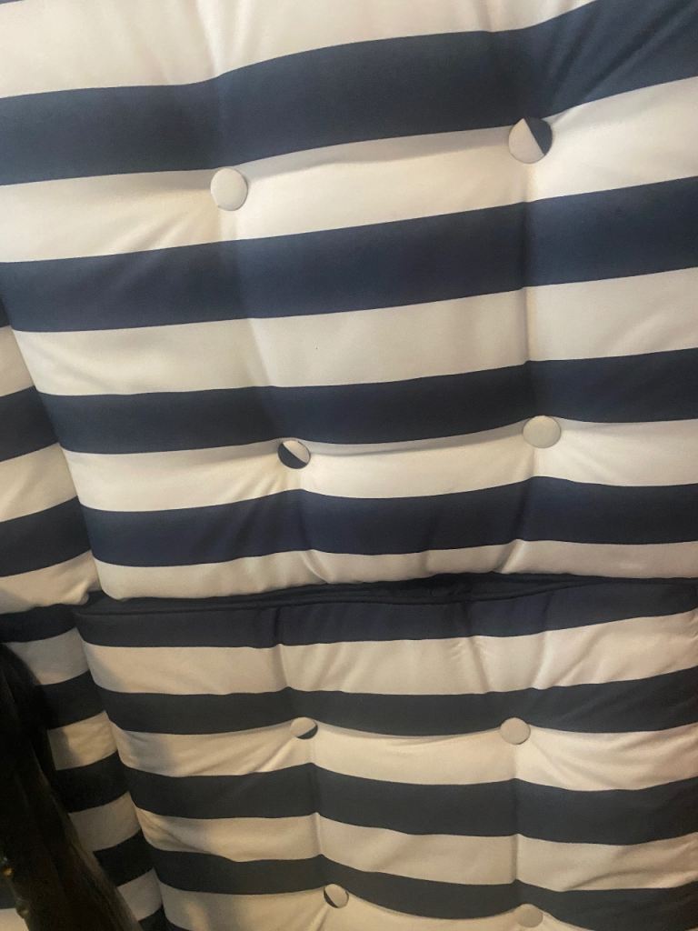 Comes with comfortable navy and white striped cushions, still with tags.