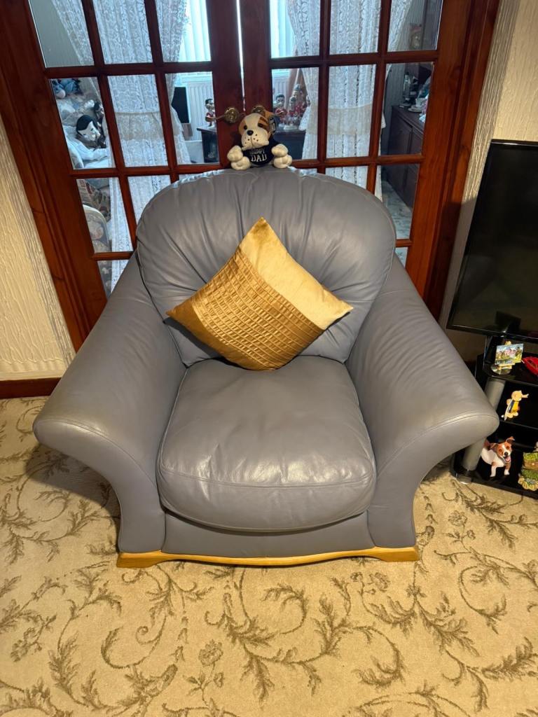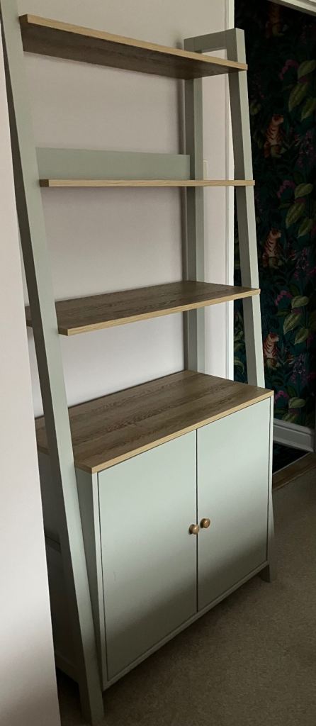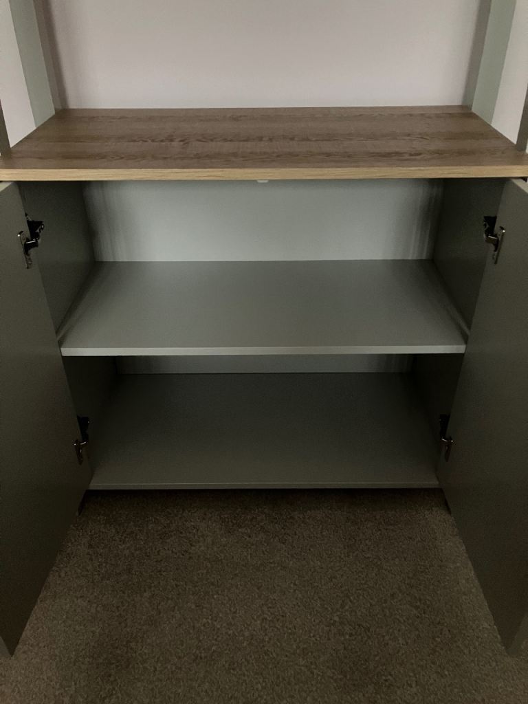 Beautiful sage colour with wooden shelving, and 2 door base unit.