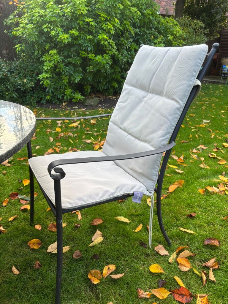 The patio set is used but is still in reasonable condition. This was a premium quality product when initially bought, the brand is Neptune. The metalwork paint and the cushions are a little faded but still okay.