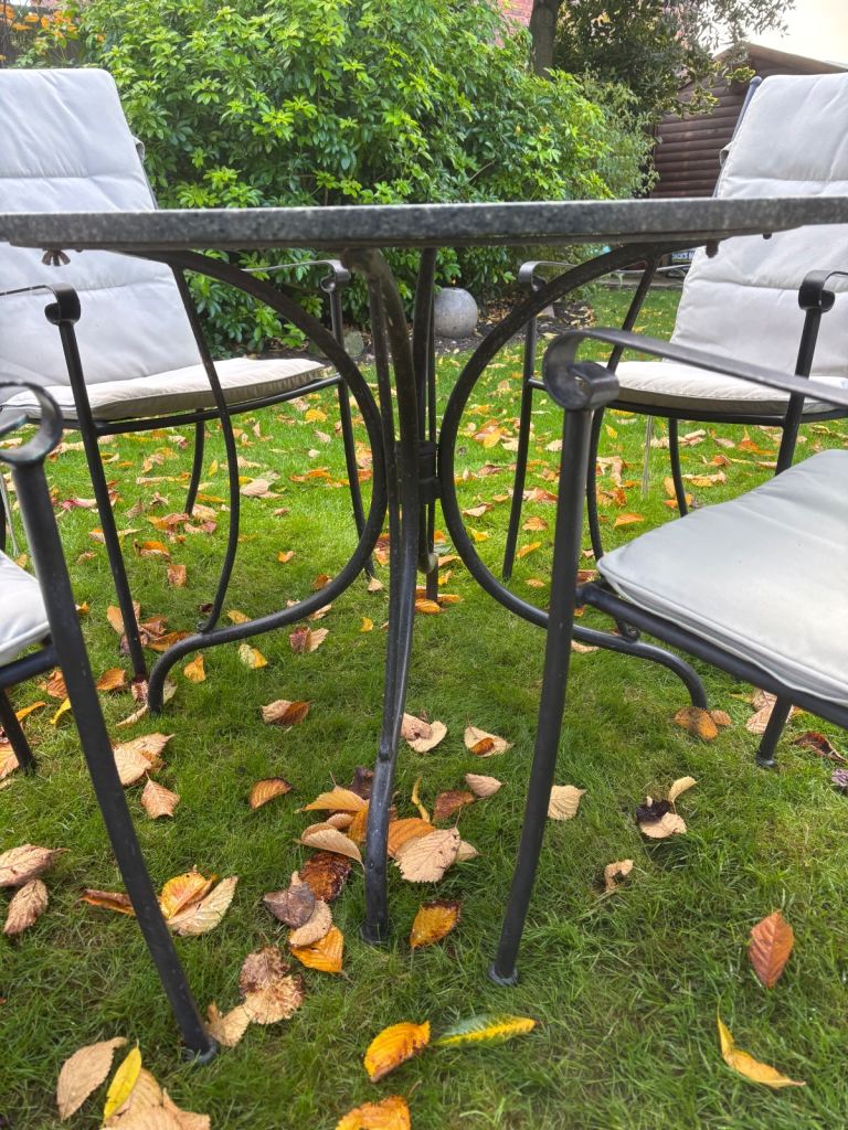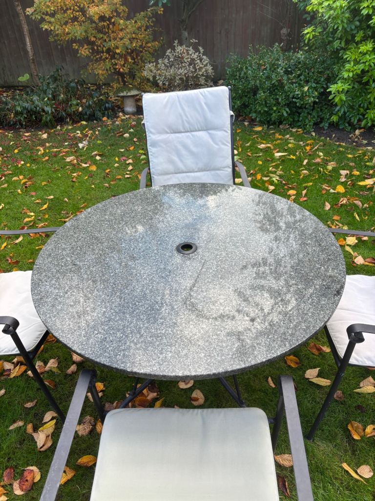 A granite table and 4 metal chairs complete with 4 seat cushions.