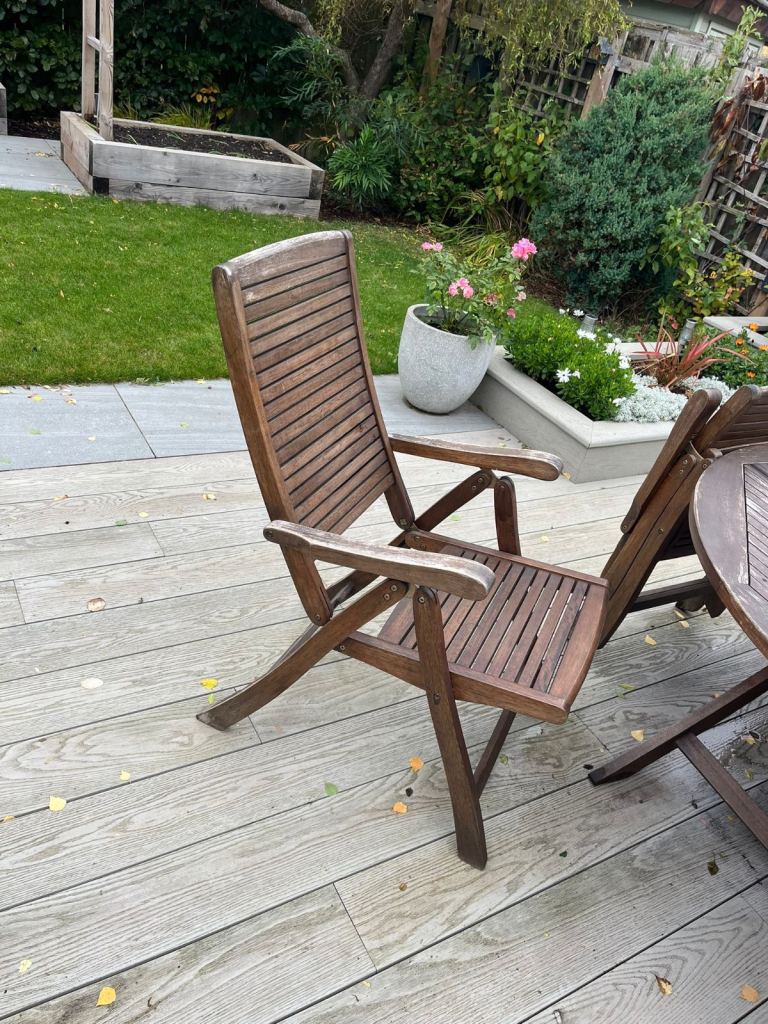 Posting for 5+ yearsHardwood round garden table & 6 chairs with parasol