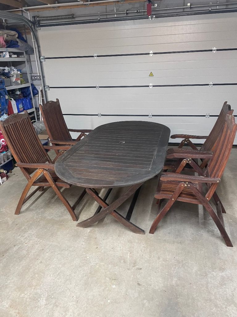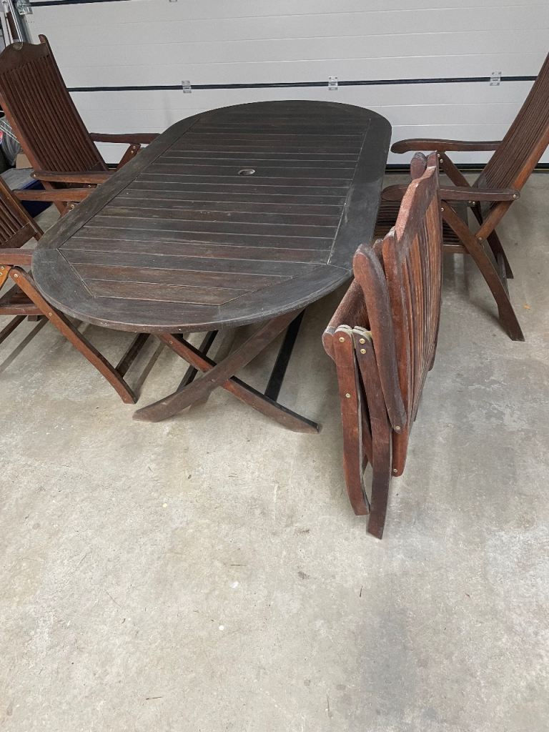 Table measures 2m x 1m , chairs recline and table and chairs fold for storage. All in good condition but has been stored in garage for a while so it’s dusty and would benefit from sanding and oiling. Buyer to collect.