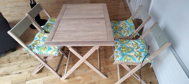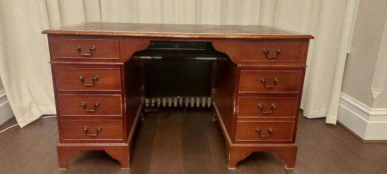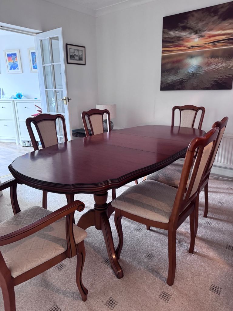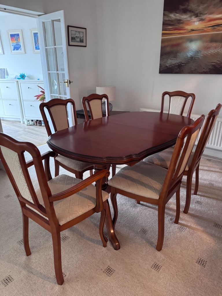 Drop leaf table made by John Coyle in a beautiful cherry colour. Table is 160 cm x 96 cm and can seat 6 adults comfortably. When extended it is 180cm x 96 cm and can easily seat 8 adults. The table top has been protected when is use by a thick table protector. We have two of these depending on whether the table has been extended or not and they will be included in the sale.