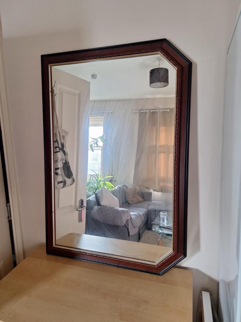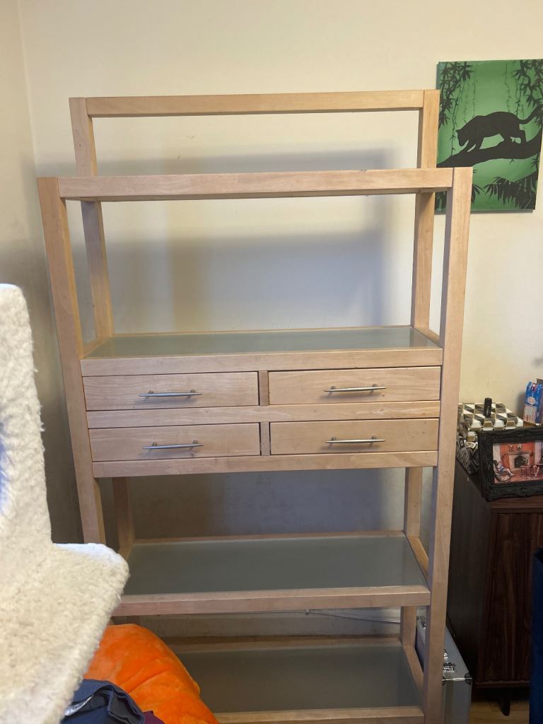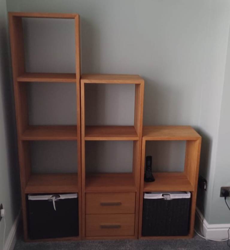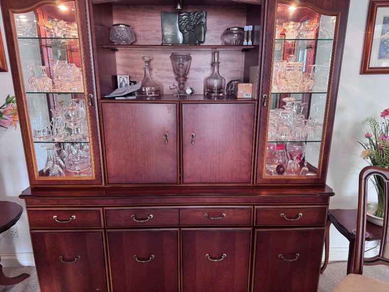 The attractive cabinet is 165cm long and 46 cm deep. The top section had two glass display cabinets with a middle section which has a cocktail cabinet with a pull out glass shelf for pouring drinks. The lower section has two small drawers each end with a cupboard underneath. The middle section has a double width, generous cutlery drawer with a double cupboard underneath. The top is joined to the lower section which makes it easier to transport.