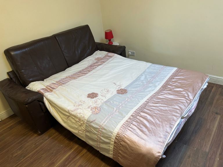 Solid brown Leather sofa cum double bed, very good condition.