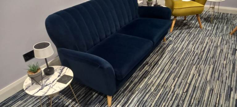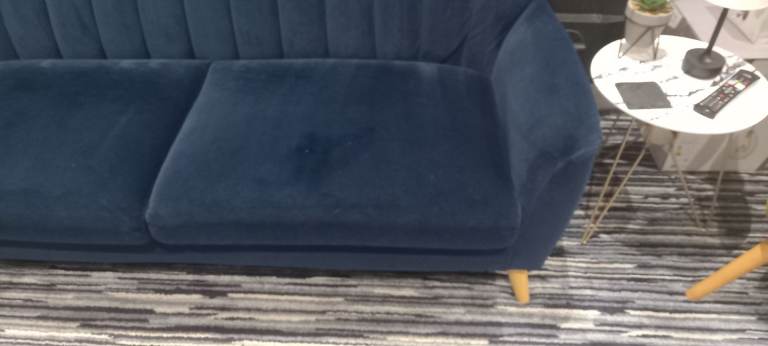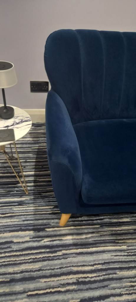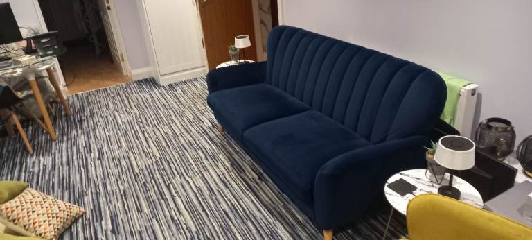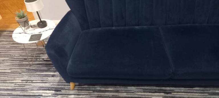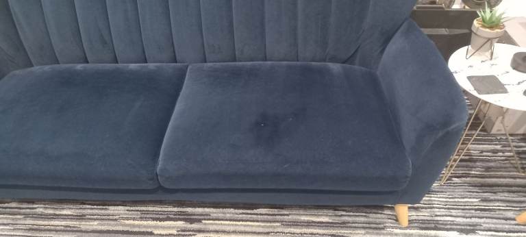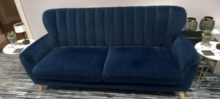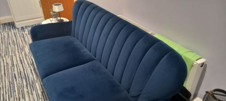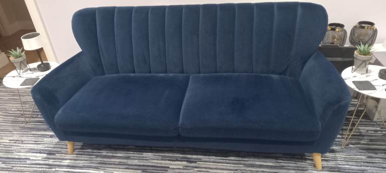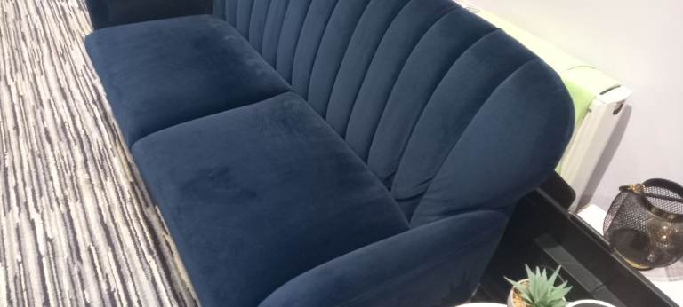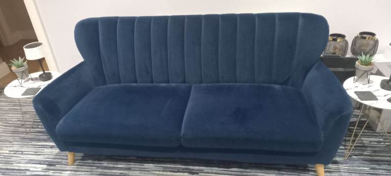 Navy Velvet 3 Seater Sofa, with Oak Feet, removal for collection, in extremely good condition, bought for additional living space, hardly used, as per pictures