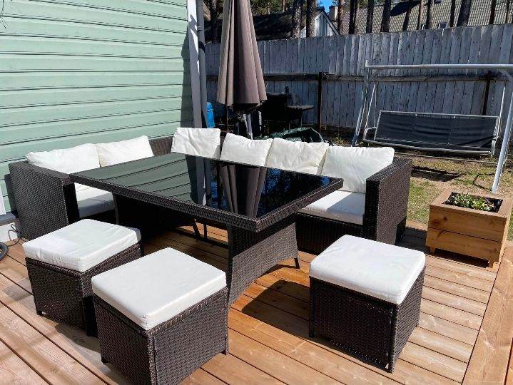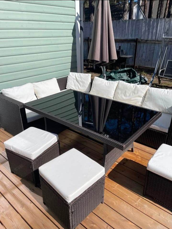 Garden furniture set for sale. Used for 3 years. One back cushion is missing, one cushion is slightly repaired (shown in the picture).