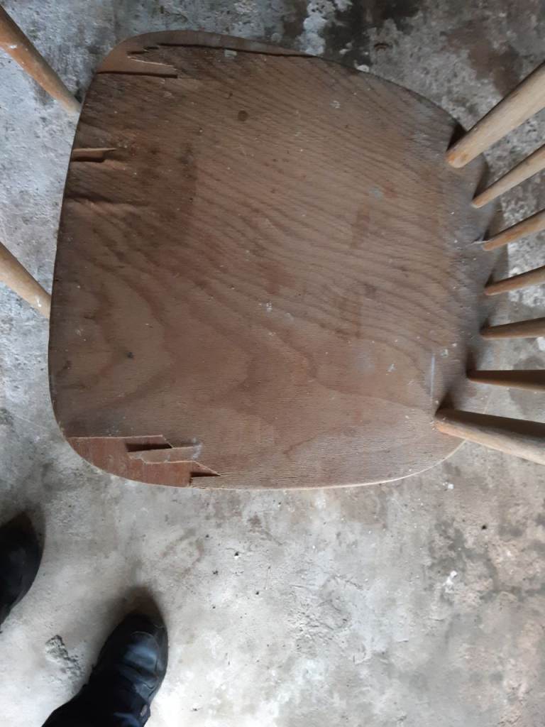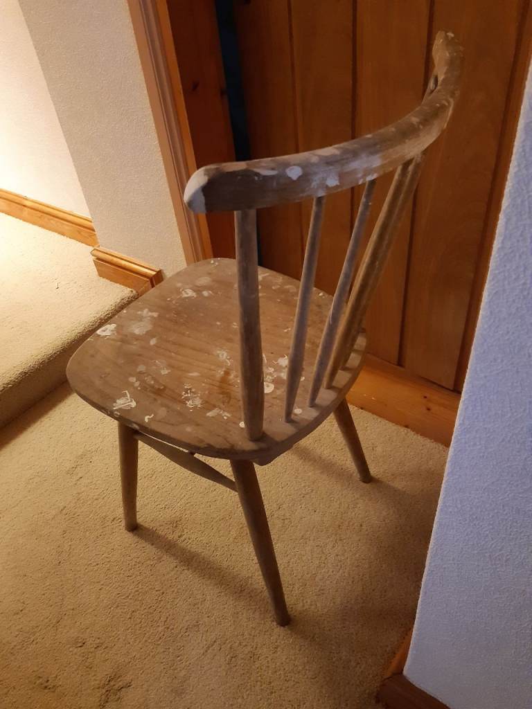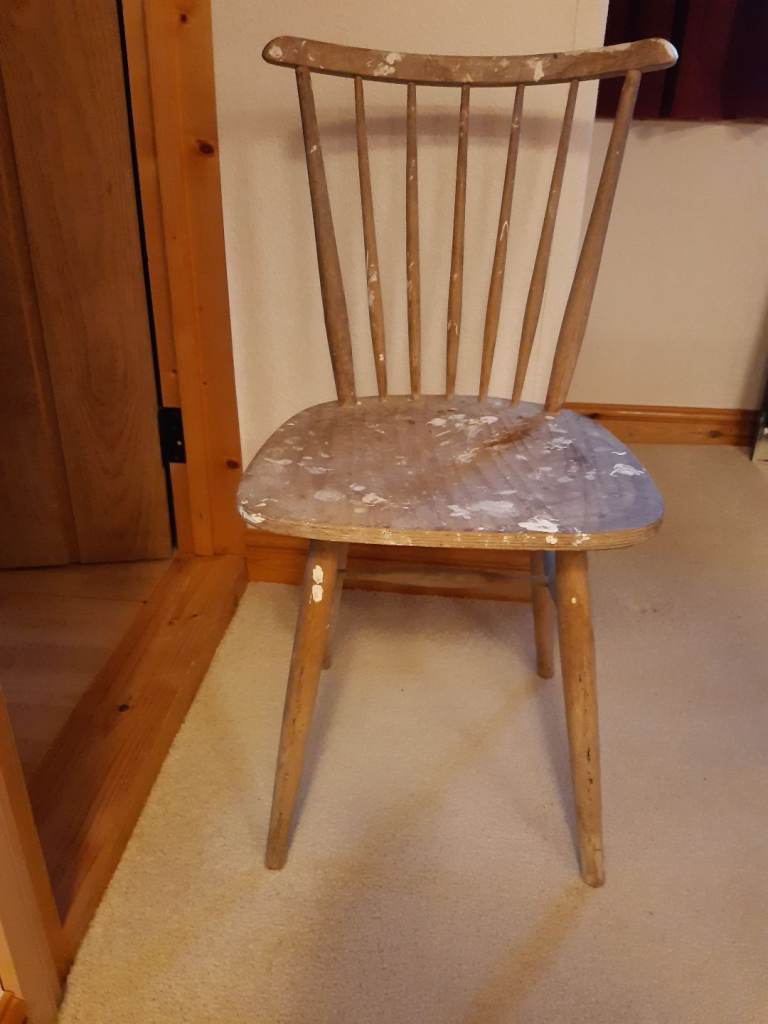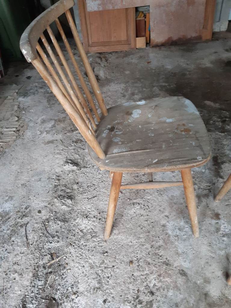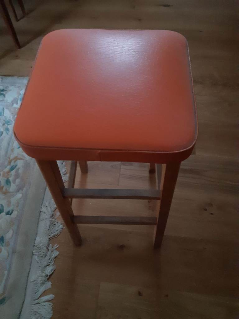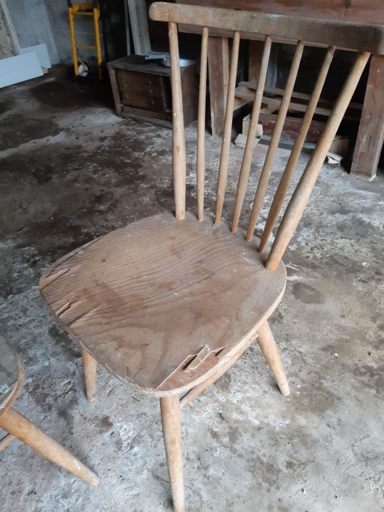 Opportunity for anyone who likes refurbishing furniture. Kitchen Stool. 3 chairs that have been used for decorating. The seats need replacing as a layer of wood has peeled off. Cane chair needs cleaning as kept in a leanto and needs cleaning off.