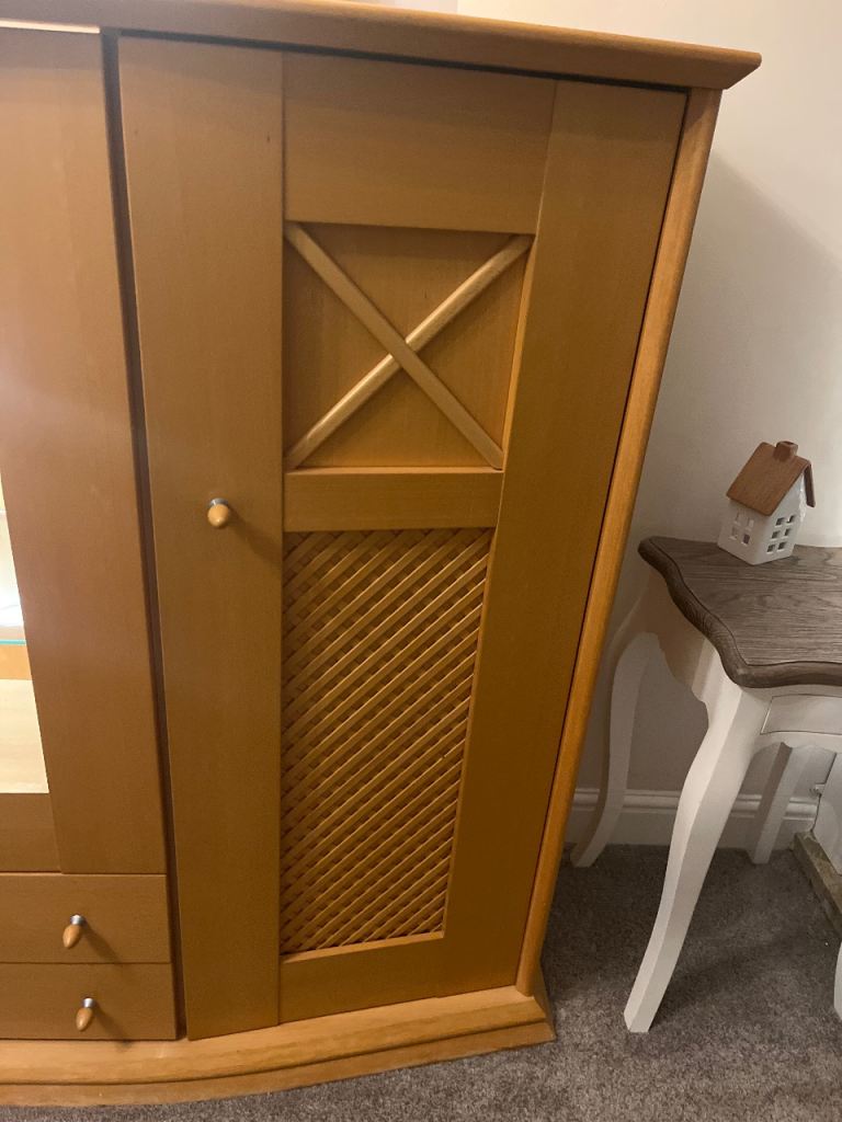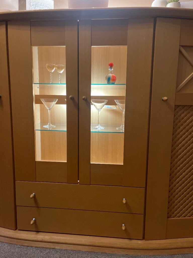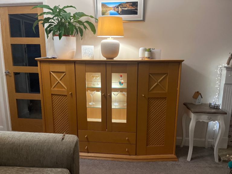 Beautiful solid wood side board, with glass shelves and working drawers, lighting inside unit. This is a stunning piece of furniture.