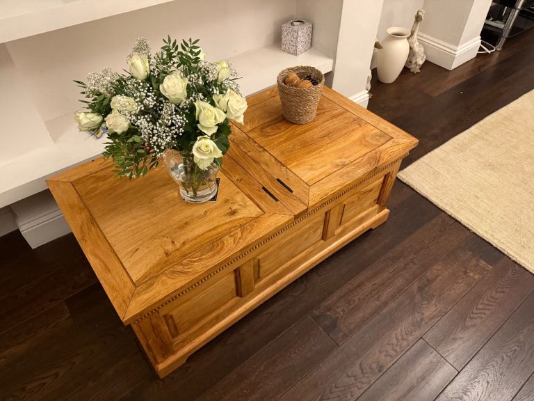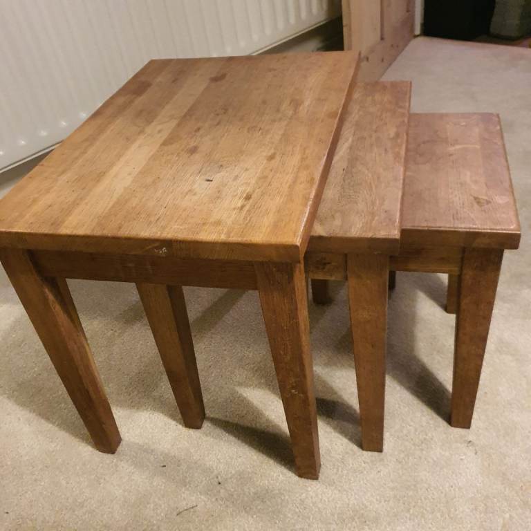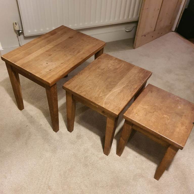 This Solid Wood Nesting Coffee Table Set is made from high-quality wood, the set includes a large, medium and small coffee table, all with a tabletop material of wood in a rich brown colour.