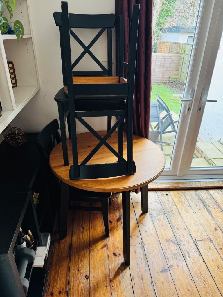 Posting for under a monthWooden Round Table + 4 Black Chairs – Compact Dining Set