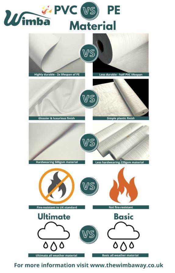 220gsm white PE material or 500gsm PVC - UV-resistant and waterproof (fire resistant PVC also available);