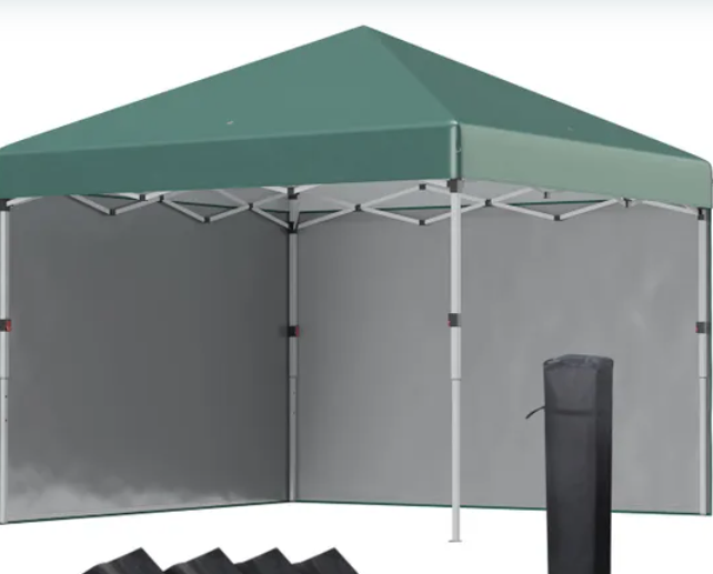 Cost 79.99 from Wilco. 3m by 3m pop up gazebo, comes with instruction manual. This Gazebo come only with top - model with no side awning. Green. Good in the wind.