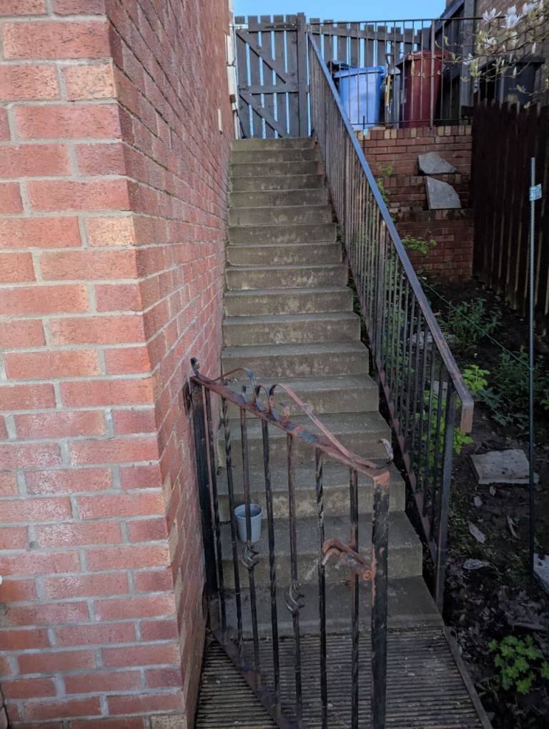 11 60cm X 90cm concrete slabs. Free to collect. They're heavy and need lifted up an outside flight of stairs as shown in the image. You'd need 2 people to lift.