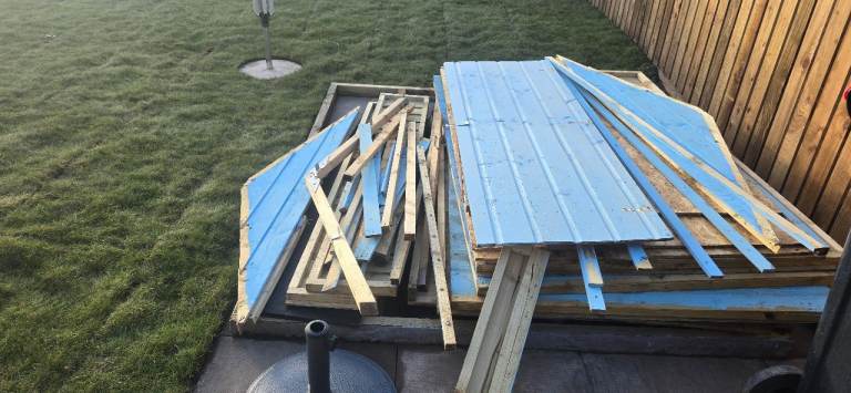 Shed for sale it's 3 years old just not big enough some small panels need to be nailed back 2 windows comes with 4" wooden base very heavy need two people to lift it needs door hinges