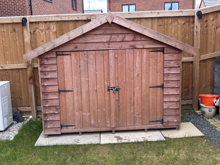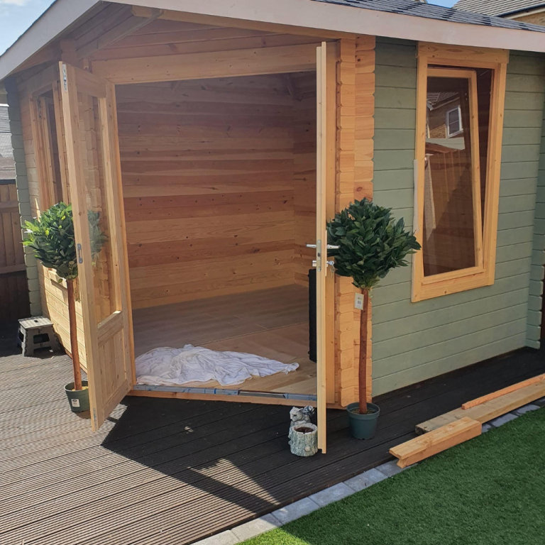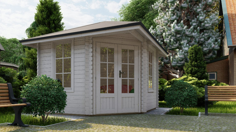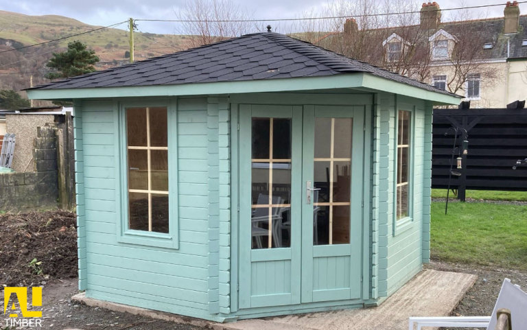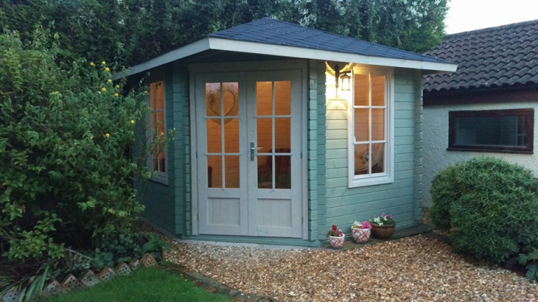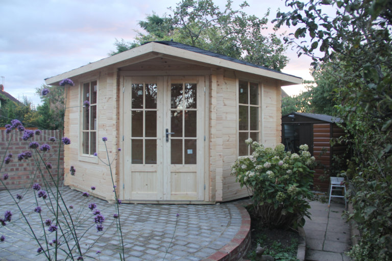 Angus Corner Cabin is a summer house perfect for the corner of a small garden. The basic floor plan is square, but the front door is where one of the corner would be. The corner cabin is a stylish and instantly upgrades any garden.