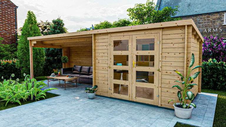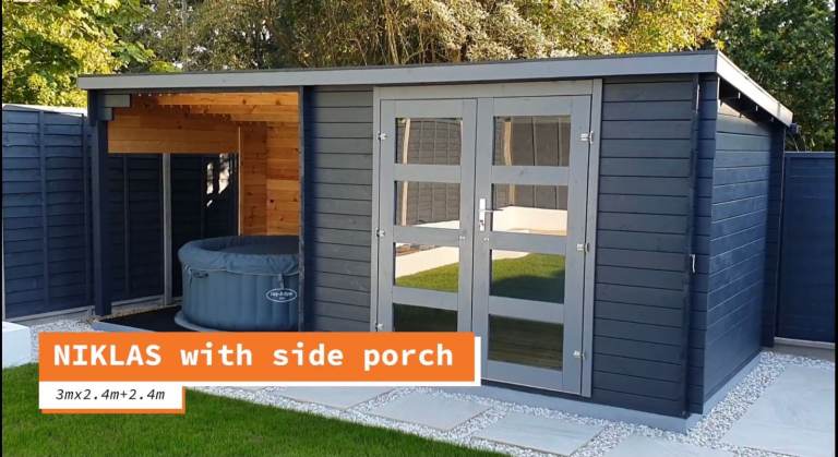 3mx2.4m+2.4m Garden shed with s side porch is a perfect outdoor room for use as a summerhouse or craft room. The double doors create a light and airy interior. If you should buy a wooden gazebo or a garden room, this summerhouse is the perfect solution to get both of them on one garden building. The porch area can be installed on either side of the log cabin during installation.