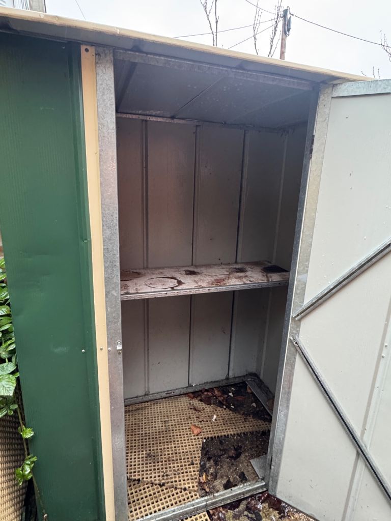 Good condition metal shed. Solid structure ideal for gardening tools.