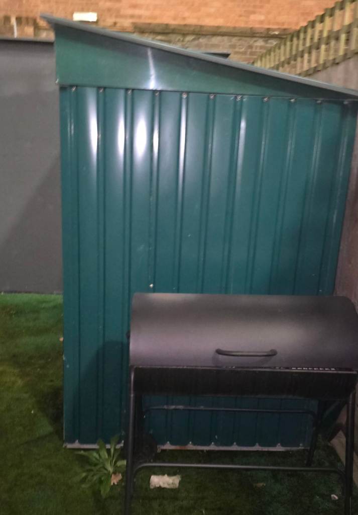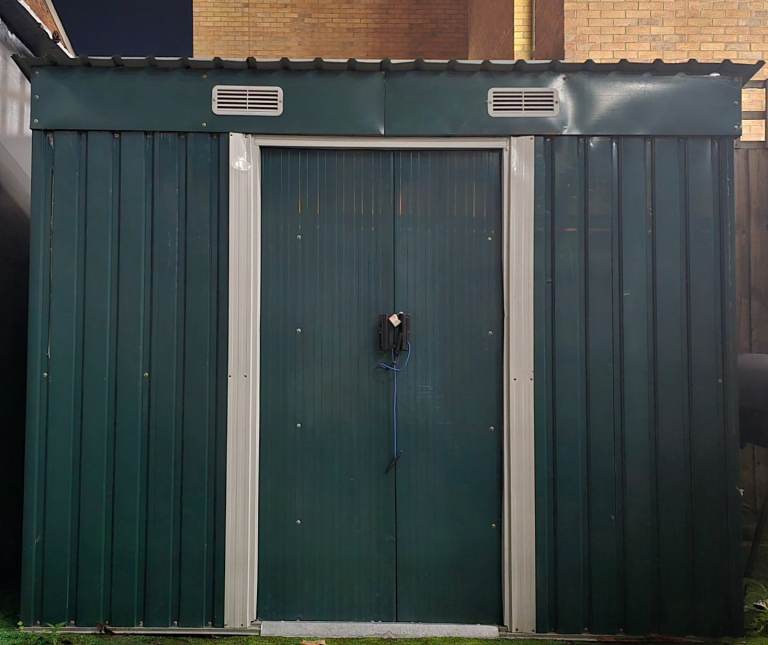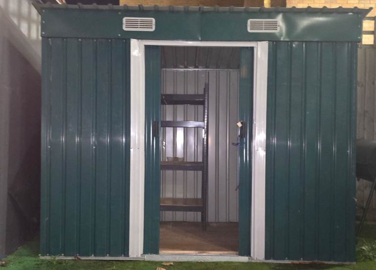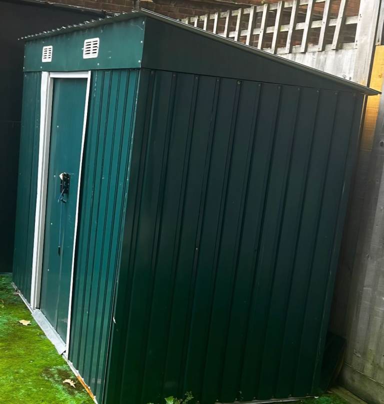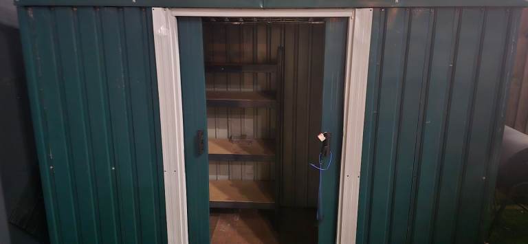 metal shed in good condition, dimensions, length 230 cm, width 120 cm, height 180/160