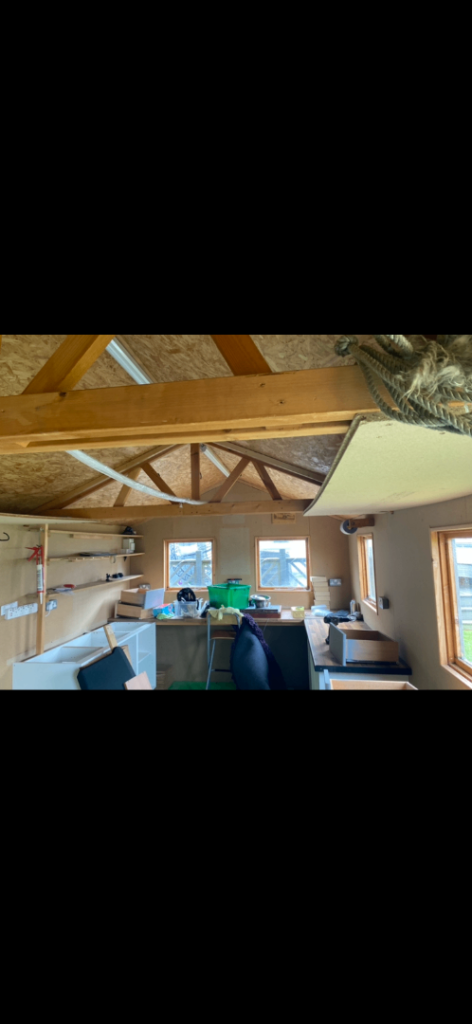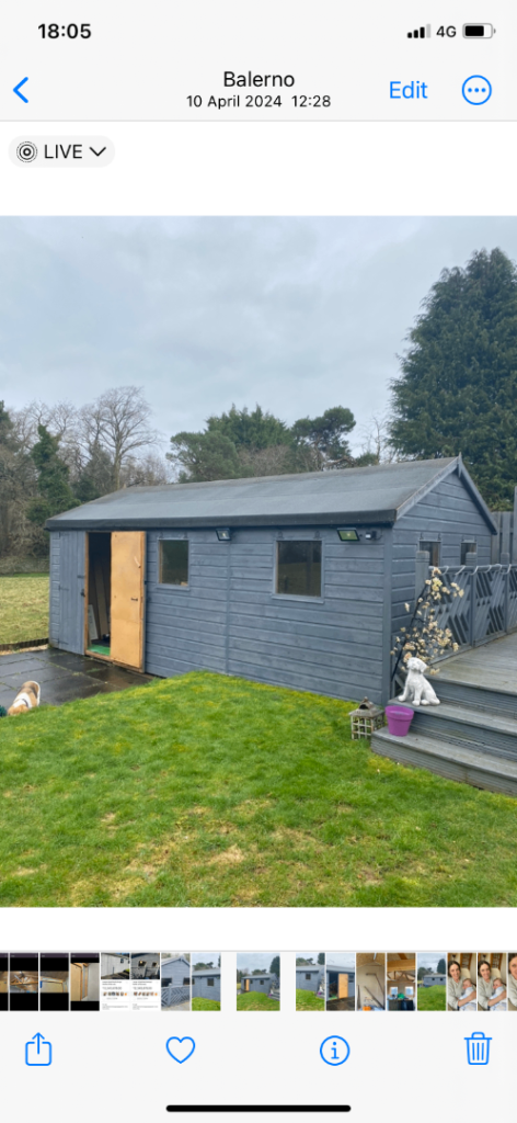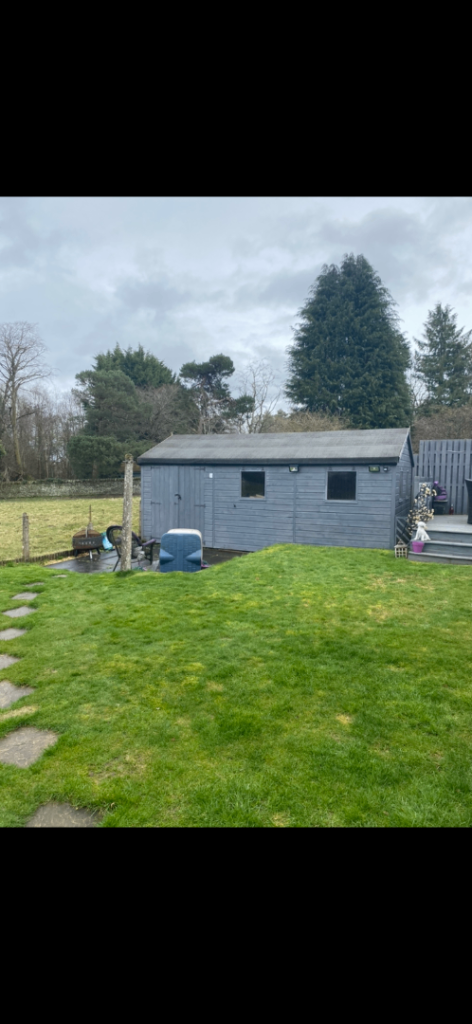 Timber shed in good condition with wooden floor & weather board sides & gables Pitched roof with 2 windows to gable & 2 windows to side plus double doors . May need a couple of boards replaced & the roof refelted Will make a great workshop/store or garden office
