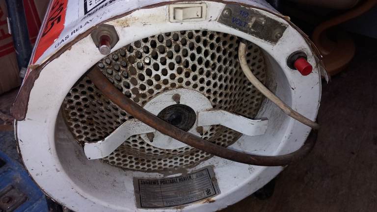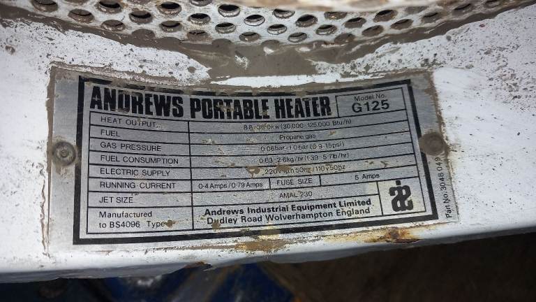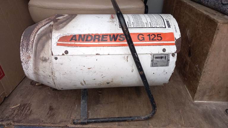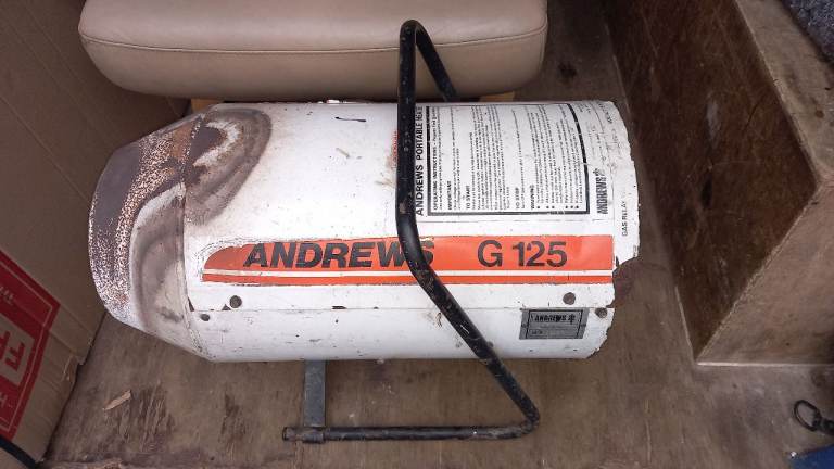 Space heater, 110 volt, site model Andrews G125, with regulator, no gas bottle. Collect from Sandyford NE2 area.