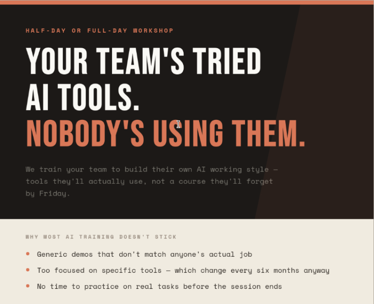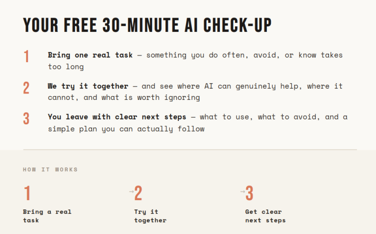 Over a few sessions we can go further, setting up better workflows, connecting AI to your actual files, or building small tools where that makes sense.