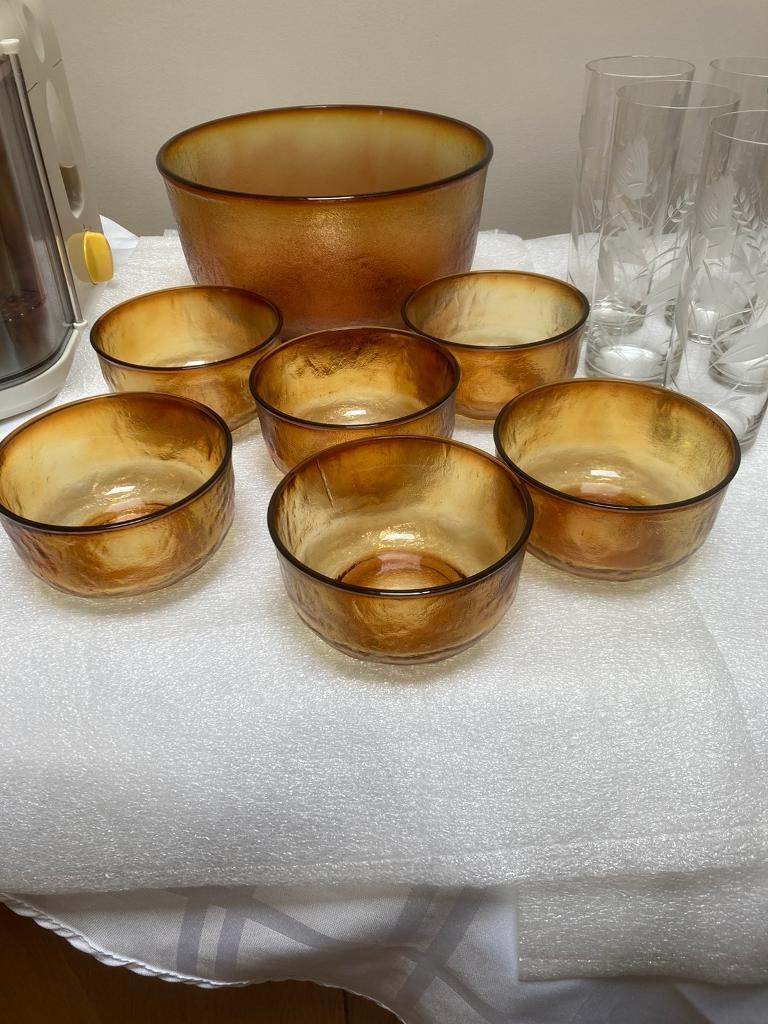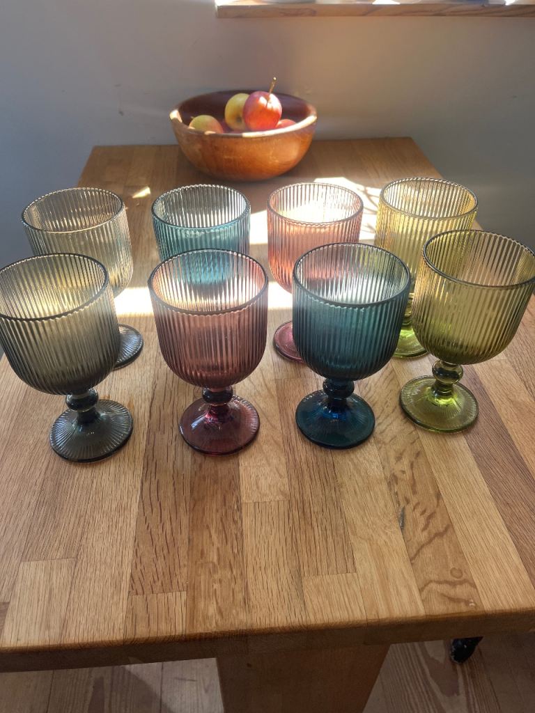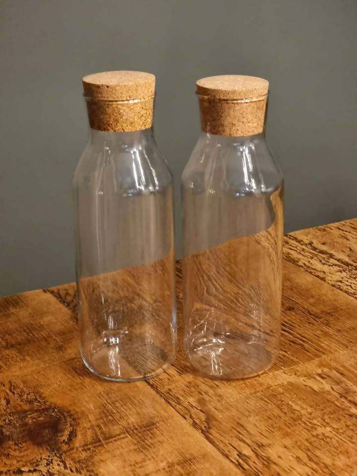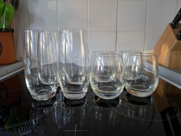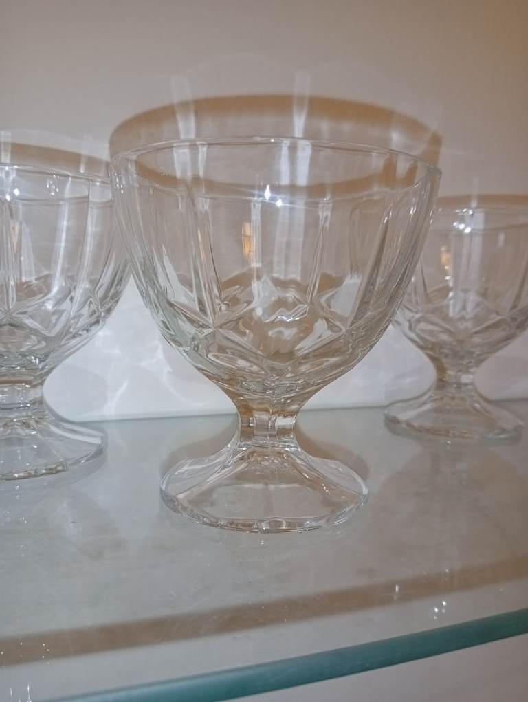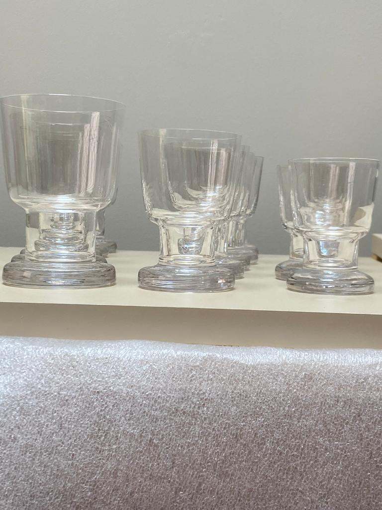 Clear glass with straight sides and thick bases. Clean, minimalist mid-century styling suitable for spirits, aperitifs, or display with vintage barware.