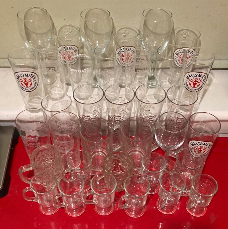 There are a mix of glasses including pint glasses, Pint Tankards, half pint mugs, Pint wines glasses, and Irish coffee drinking glasses. Roughly 34 in total. Collection Cardonald G52