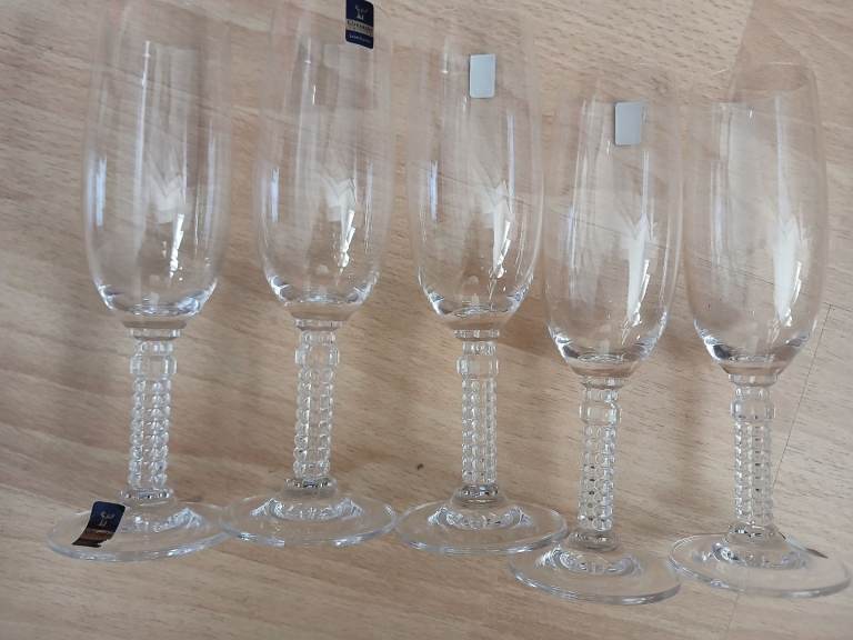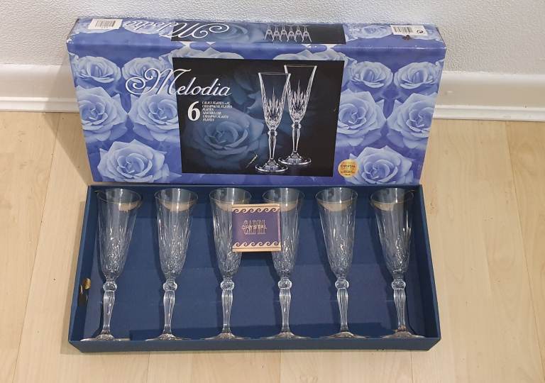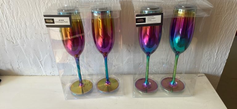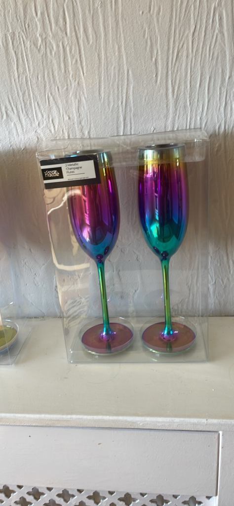 Four brand new multi coloured champagne flutes still in packaging excellent condition