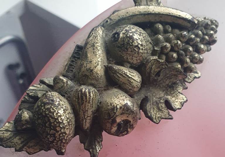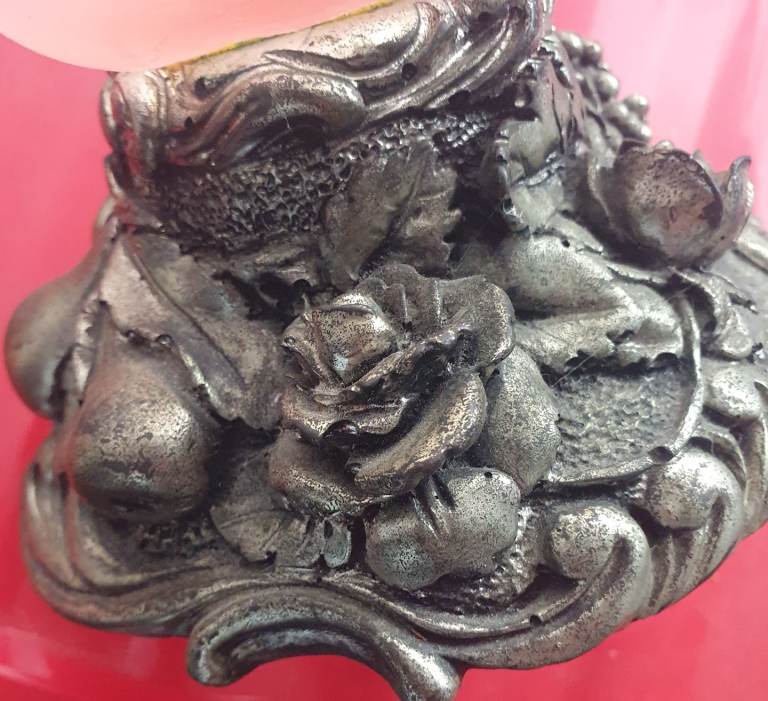 Beautiful Antique Frosted pink glass bowl with metal ornate base & on side of bowl.