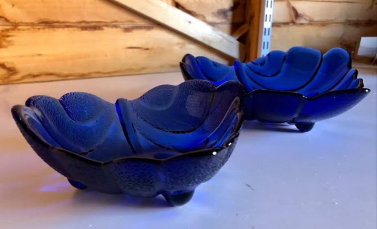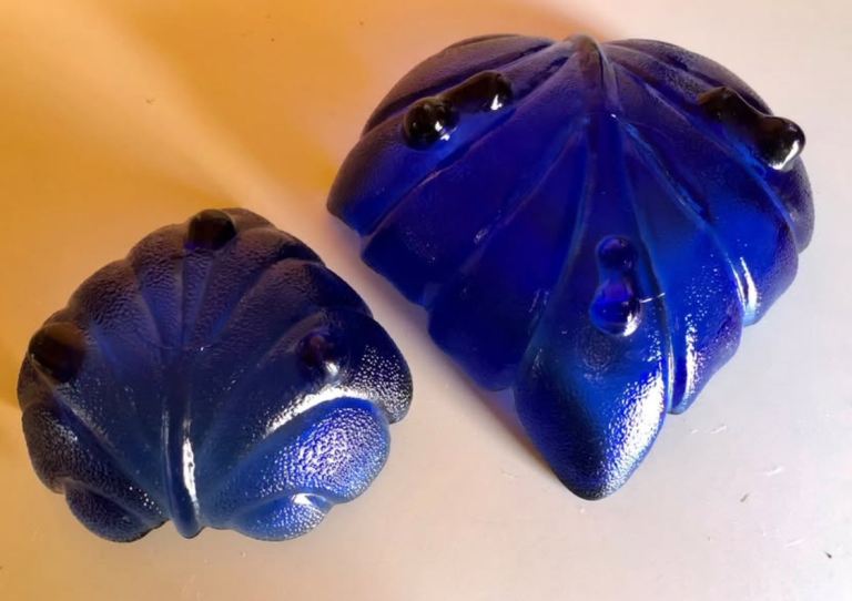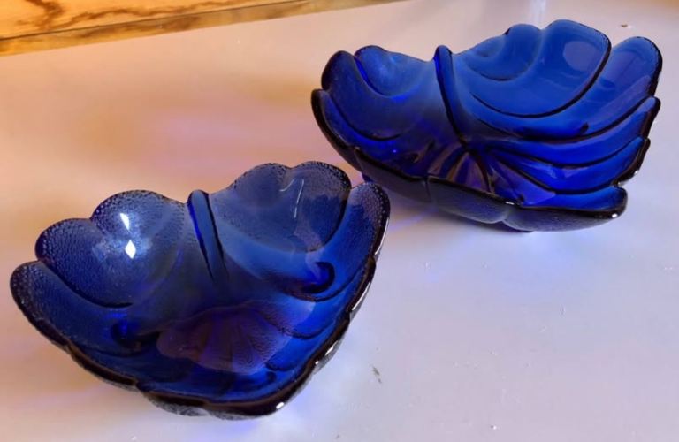 Posting for 13+ yearsBeautiful Set Two Vintage Cobalt Blue Thick Glass Leaf Dishes Bowls