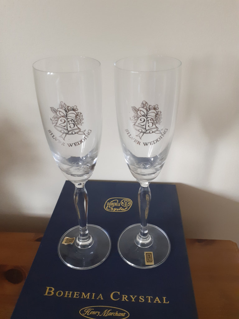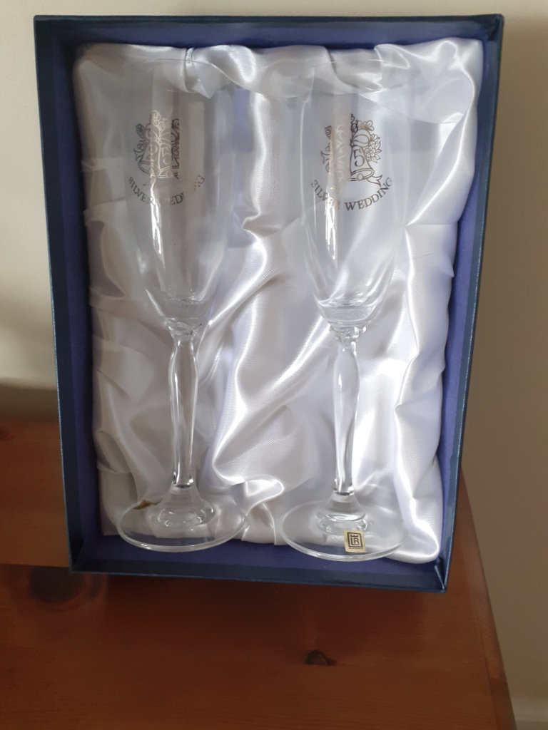Beautiful crystal champagne flutes to celebrate silver wedding. Only taken out of box to photograph. Come in a lovely satin lined presentation box.
