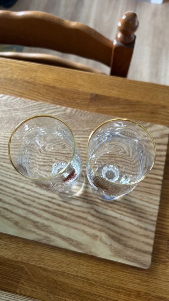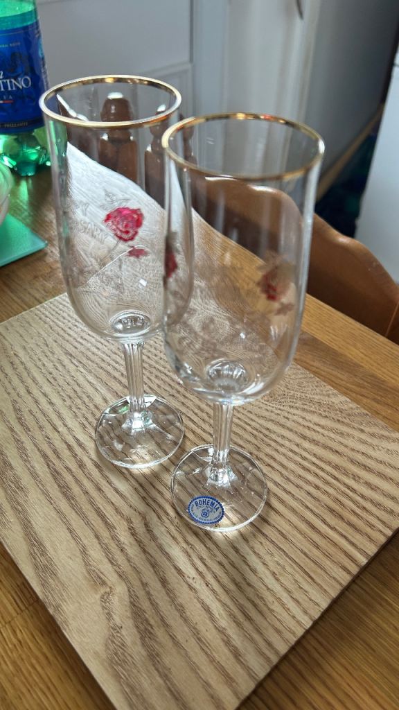 Bohemian 2 anniversary champagne glasses with retro engraving, red/gold roses decor, height 19.4 cm in good condition.Pick up from G73.