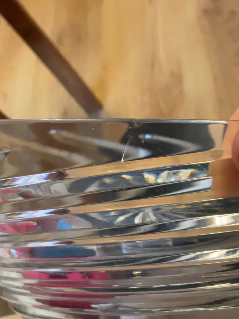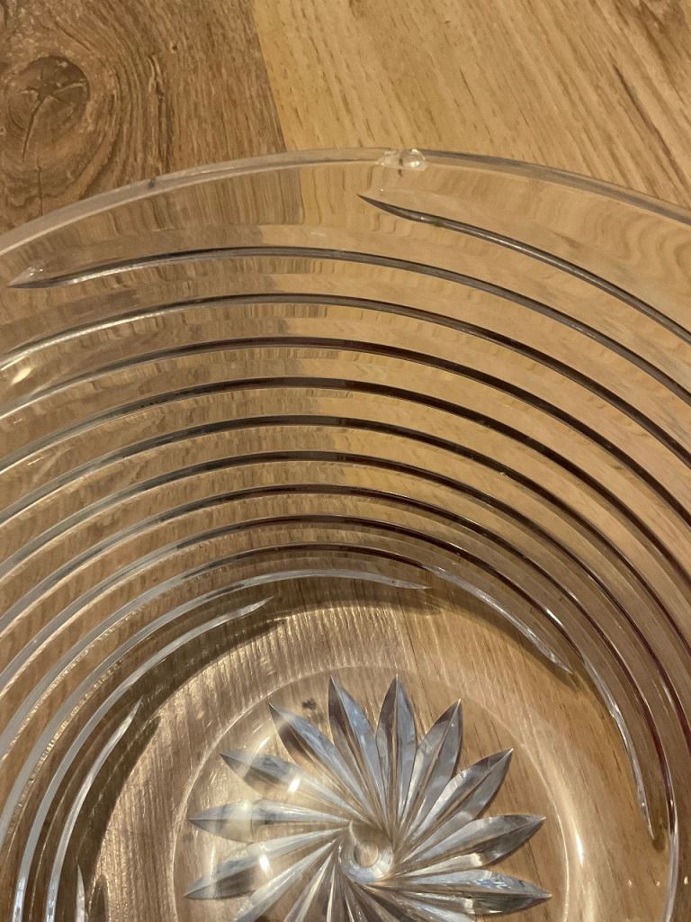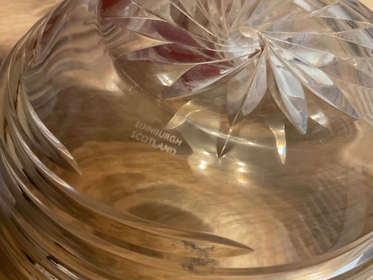 CASH & COLLECTION ONLY, CRAYFORD, KENT. Edinburgh Crystal Fruit bowl. Has a chip and a very small crack. Approx 10cm high. See all photos. Was a wedding present in late 1990s. Unusual spiral/swirl design.