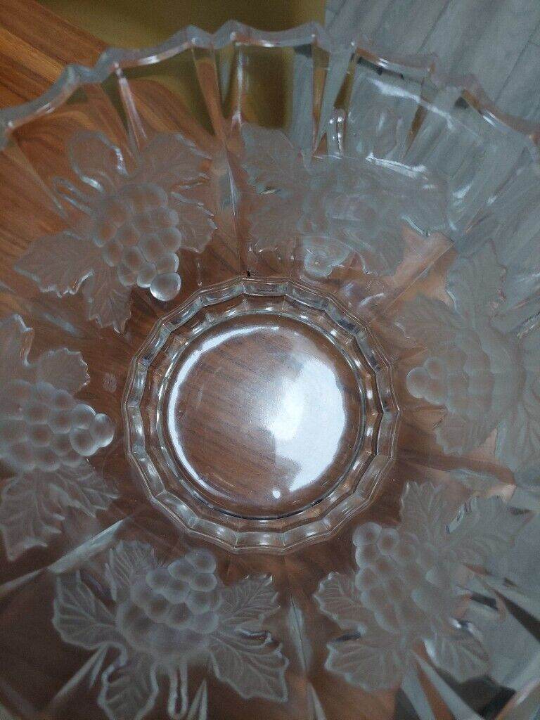 Glass fruit bowl with frosted 3D grape detailing. in used condition slight black dot on bottom side. (See image references).