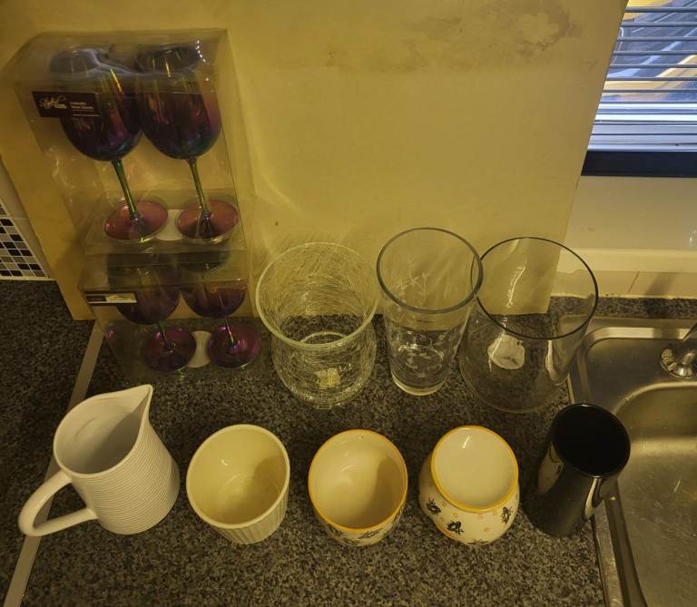 Posting for 1+ monthsGlassware Bundle – Oil Slick Rainbow Wine Glasses, Vases, Bowls, Jug – Moving Sale