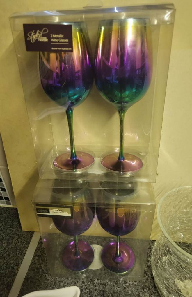 • 4 oil slick rainbow wine glasses (boxed sets)