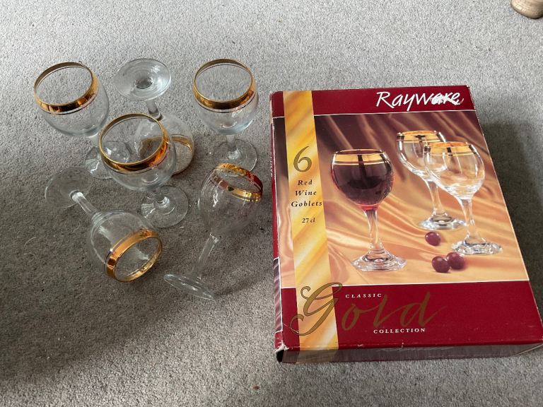 6 red wine glasses, very elegant, in original box. Unused. Must collect WV3 Wolverhampton