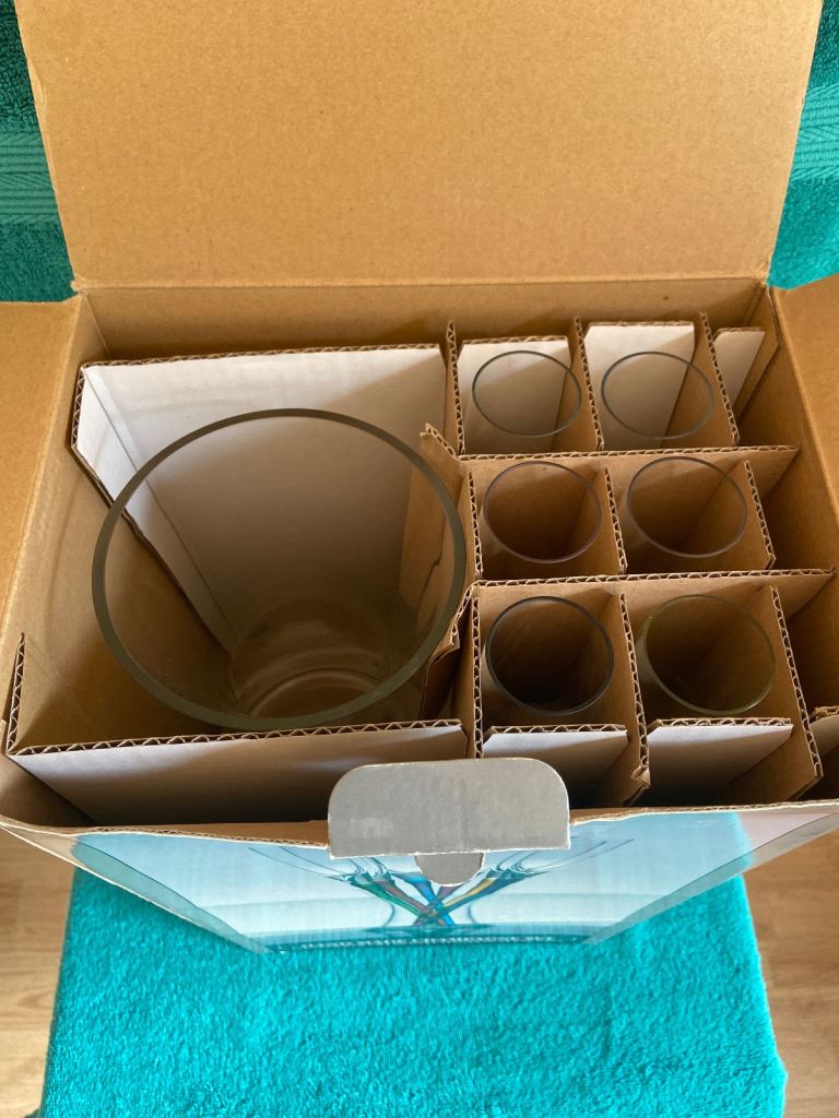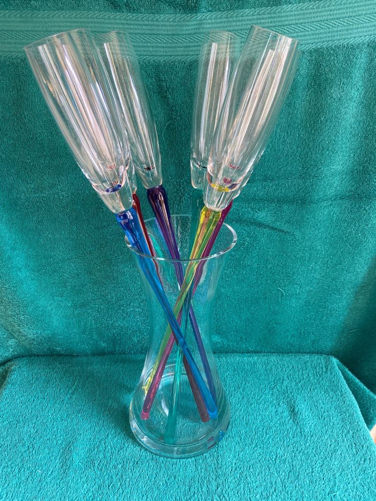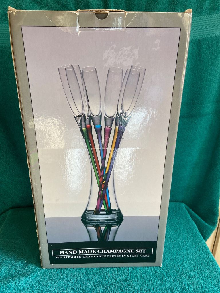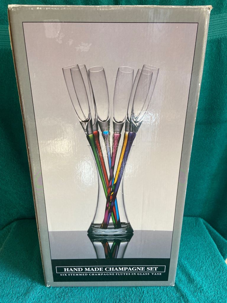 Handmade Champagne set. 6 stemmed flutes with vase. Boxed