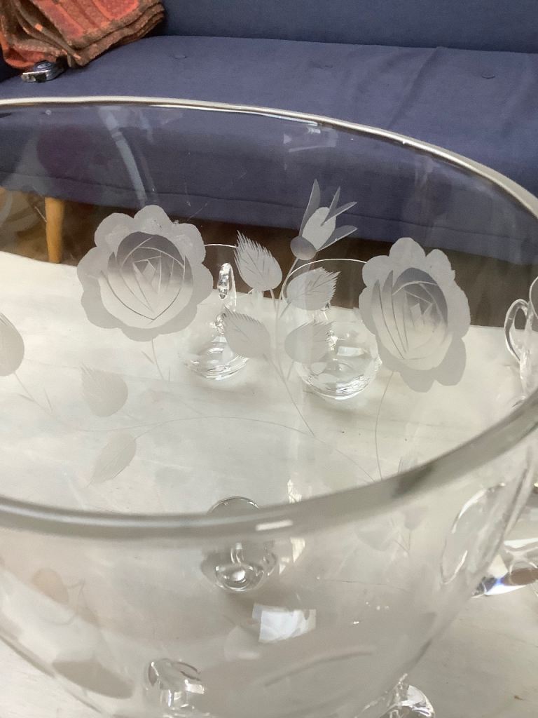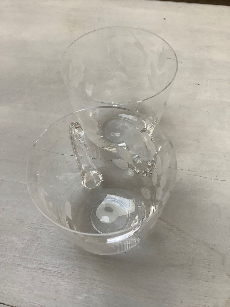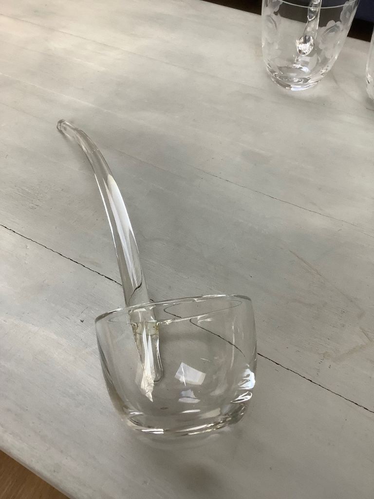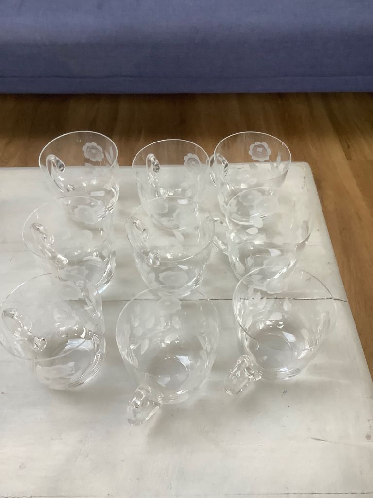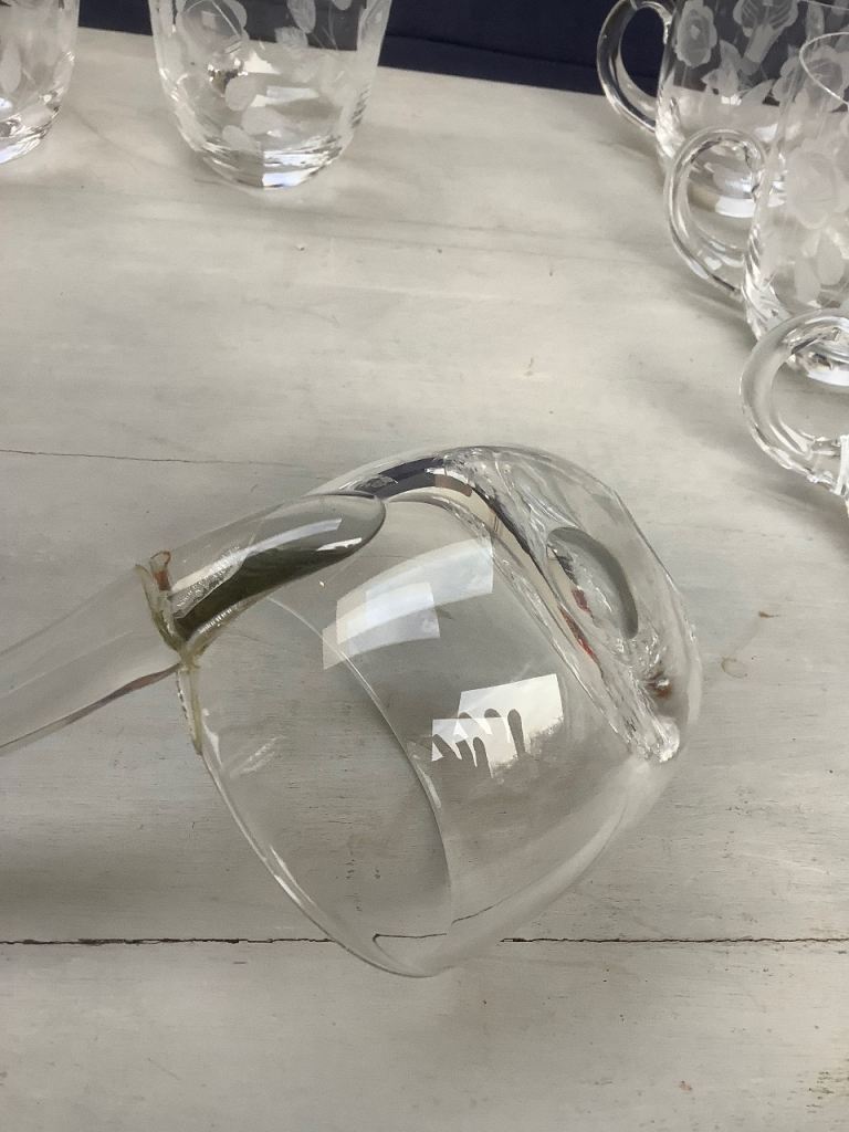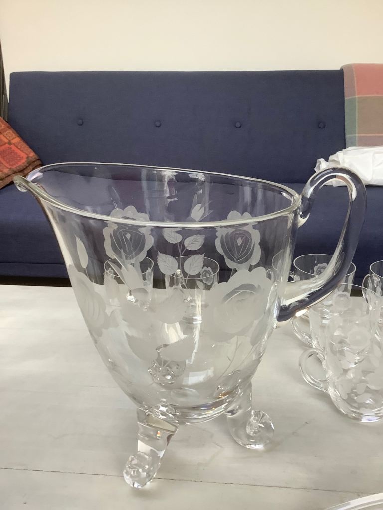 A glass jug punch bowl, with etched glass design, with 9 matching cups/glasses. I believe they are crystal as they give a nice ping sound. The ladle has some damage, but it’s a solid repair. There are also two more glasses with slight chips.