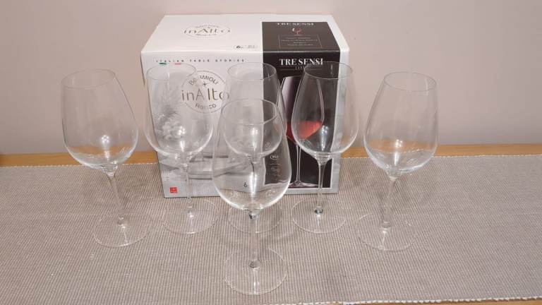 6 Brand new Bormioli red wine glasses boxed in excellent condition pet and smoke free home never been used can deliver